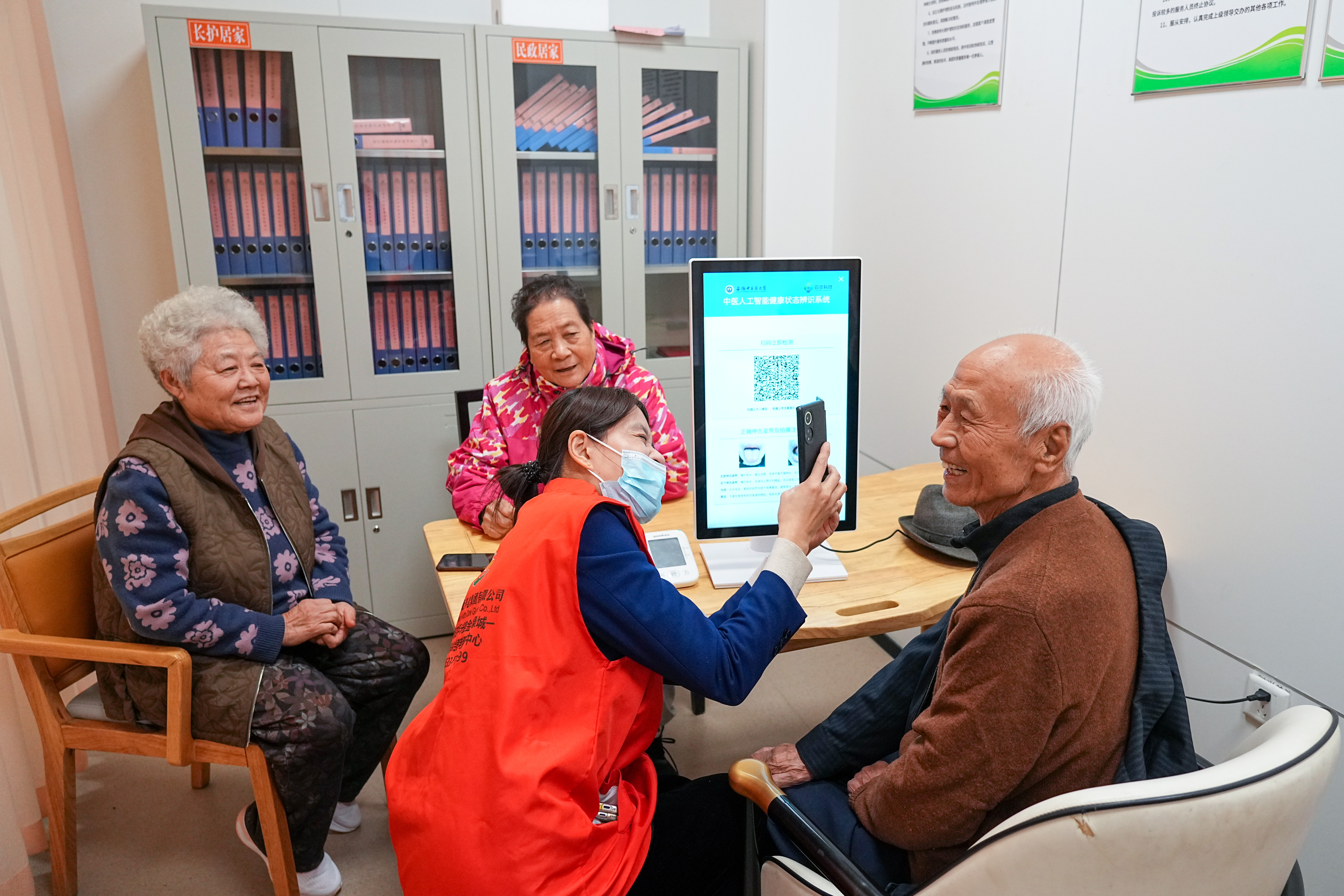 2025年10月23日,老人们在山东省淄博市张店区马尚街道金石社区日间护理中心测量健康数据。新华社记者朱峥摄