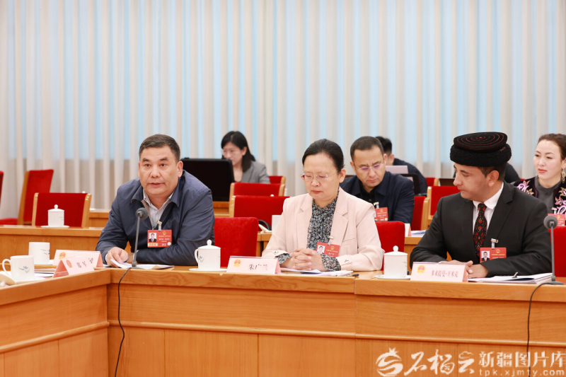 图为库尔班·尼亚孜(前排左一)3月7日在小组会议上发言。石榴云/新疆日报记者 崔志坚摄