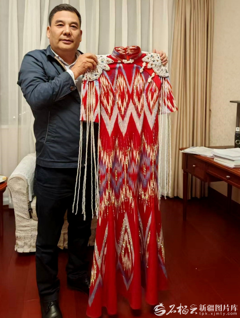 说到这,他从随身带的提包里拿出一顶红色维吾尔族花帽:“这上面绣的花纹有中国结、回字纹,将不同民族的文化融在了一起。”介绍完花帽,他又拿出一条红色艾德莱斯绸裙子向大家展示:“这条裙子的不同之处是,领口这里有一枚唐装和旗袍经常用到的盘扣。”