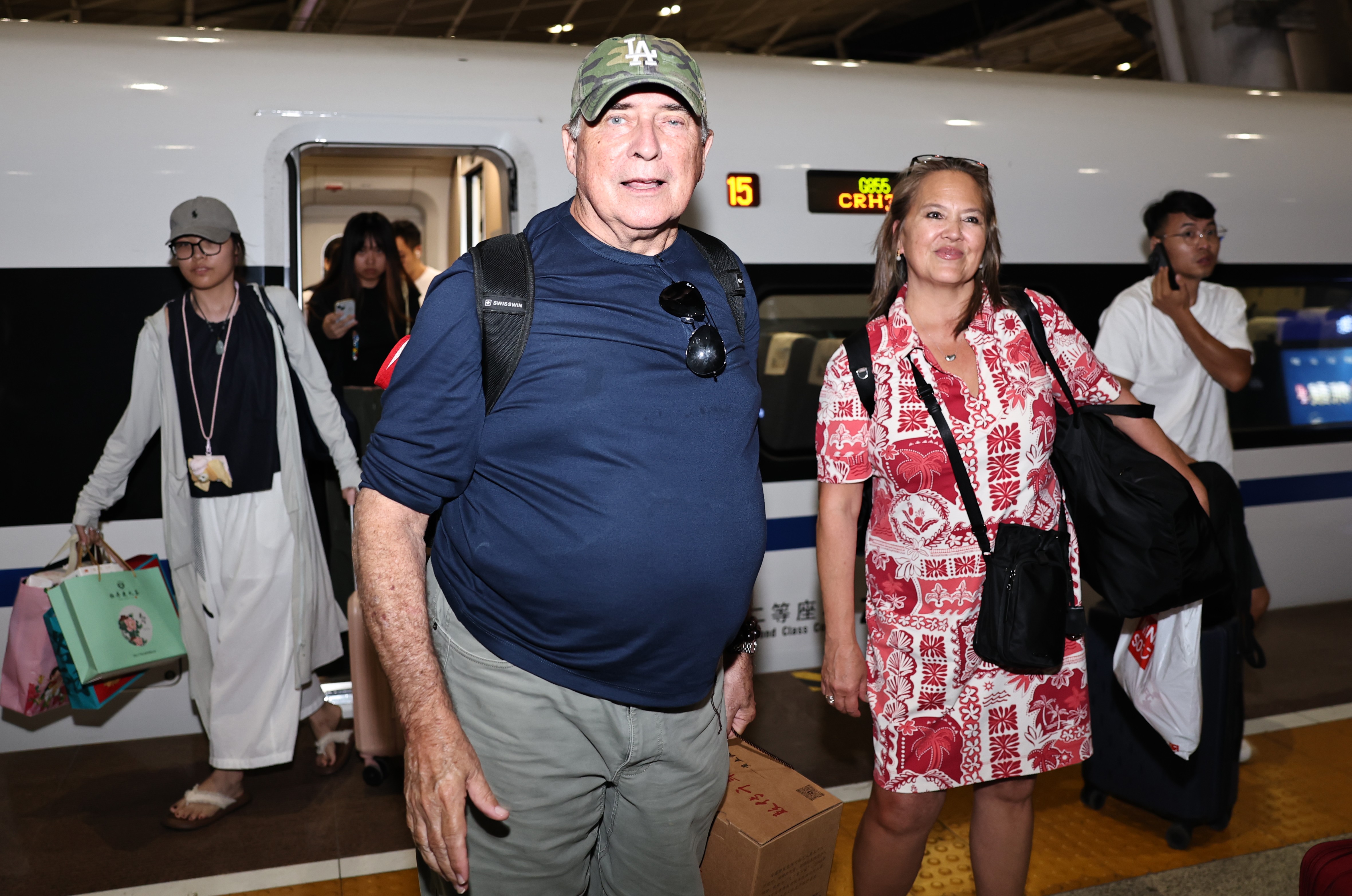 7月26日,美中航空遗产基金会主席杰夫·格林等一行乘高铁到达武汉。新华社发(陈迹 摄)