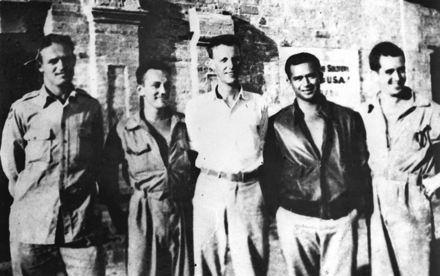 二战期间,被新四军营救的5名飞虎队飞行员在新四军驻地合影(资料照片,1944年8月摄)。新华社发