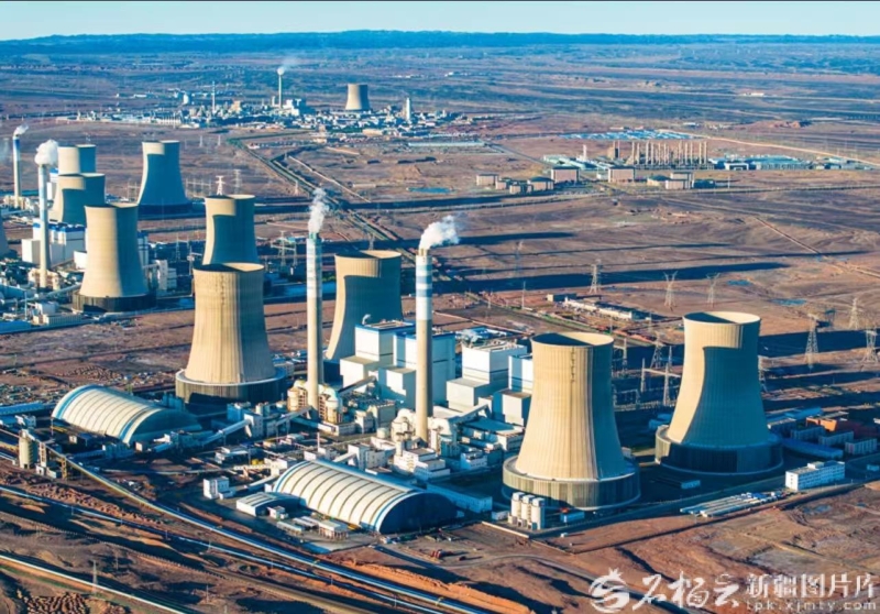 中电投新疆能源化工集团五彩湾发电有限责任公司两台66万千瓦火电机组正在运行(5月7日无人机摄)。 何龙摄