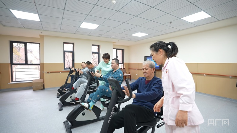 护理工作人员带领老人做运动 (央广网记者丁安 摄)