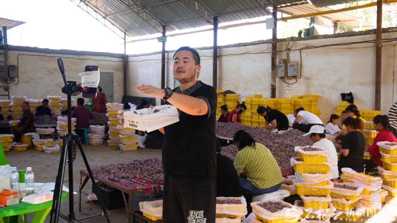 今年8月新梅丰收季,伽师县直播达人对伽师新梅进行网上推介。图片由喀什地区融媒体中心提供