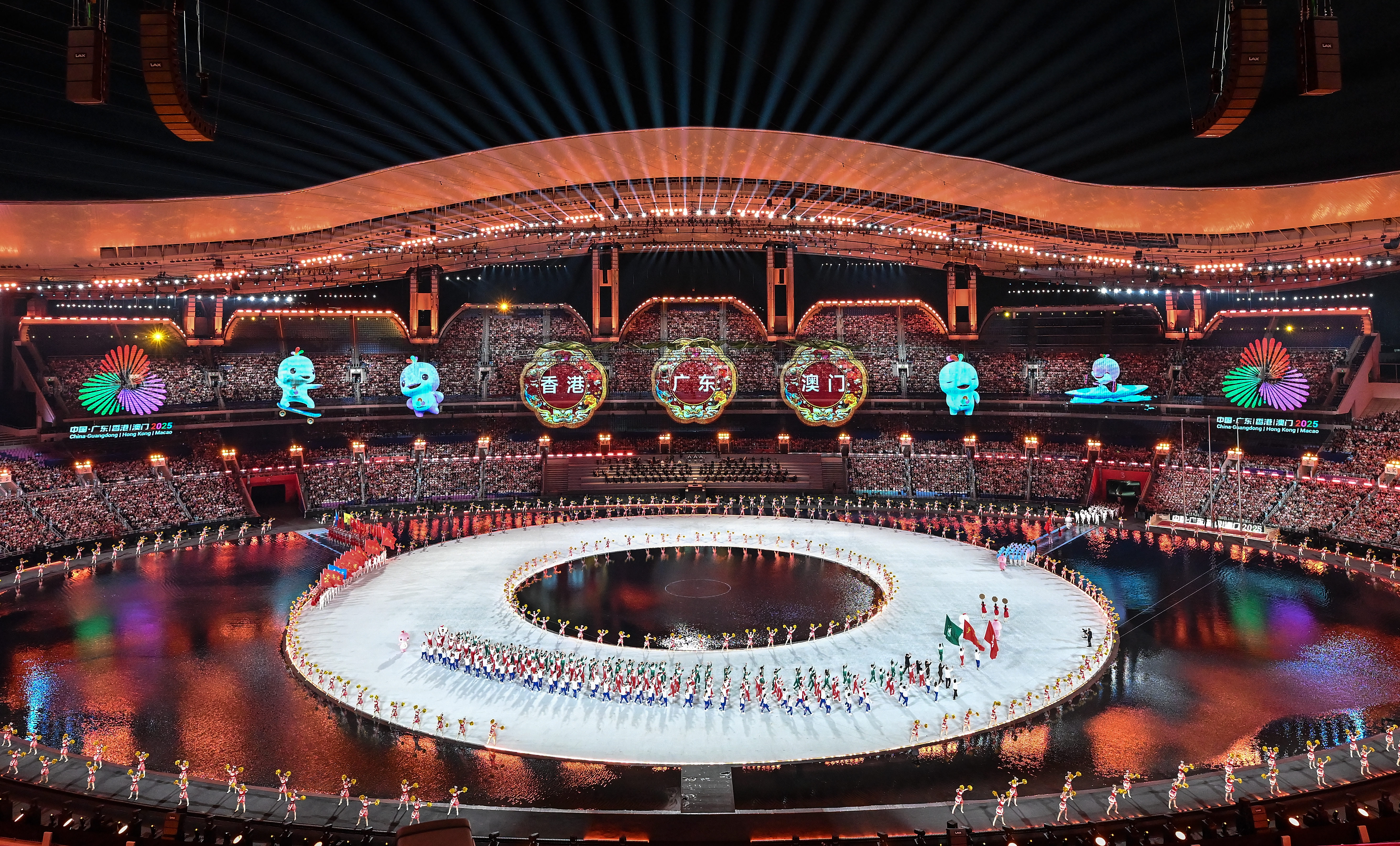 2025年11月9日,第十五届全国运动会开幕式在广东奥林匹克体育中心举行。这是广东省体育代表团、香港特别行政区体育代表团和澳门特别行政区体育代表团在入场仪式上共同入场。新华社记者 李鑫 摄