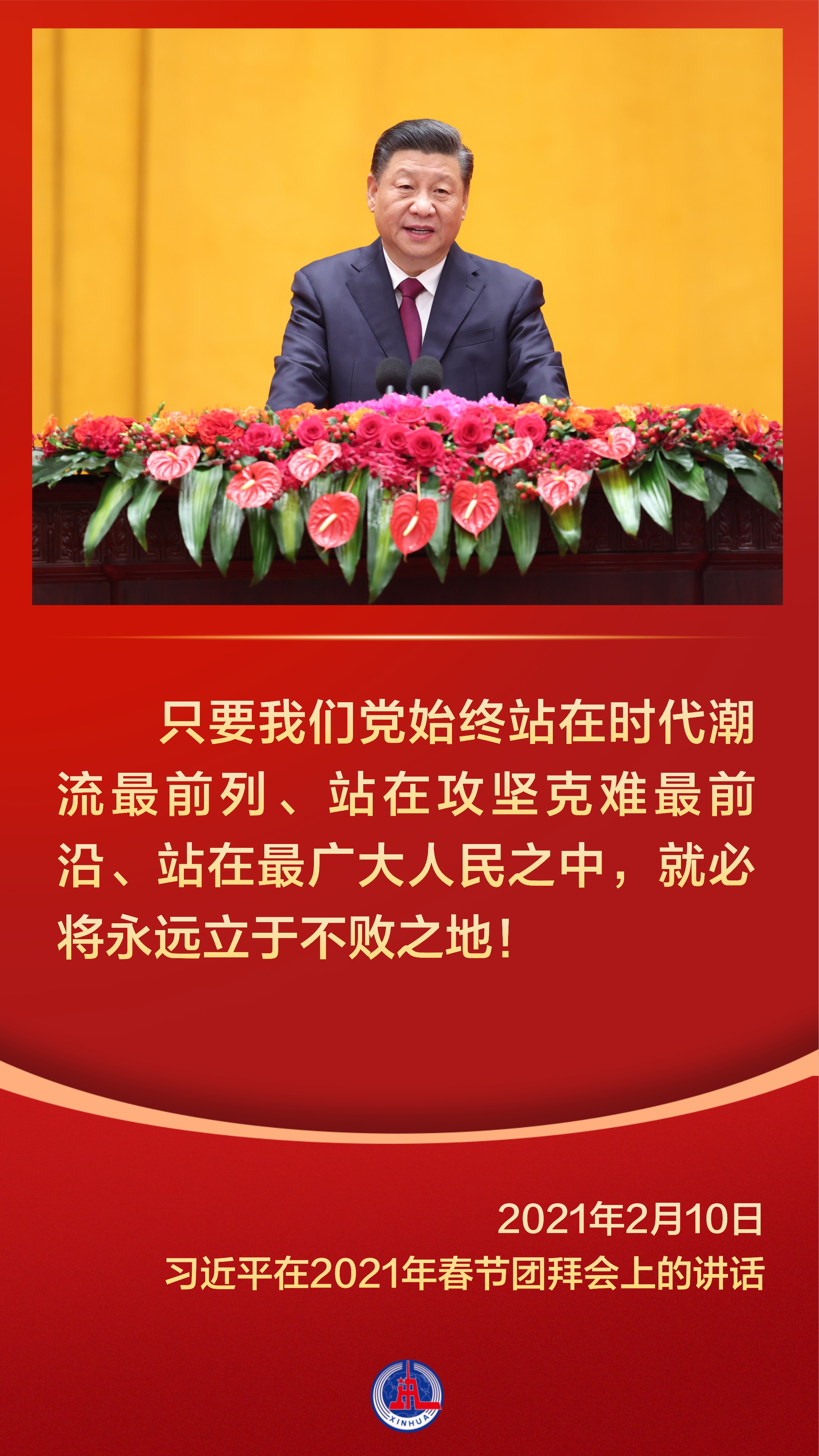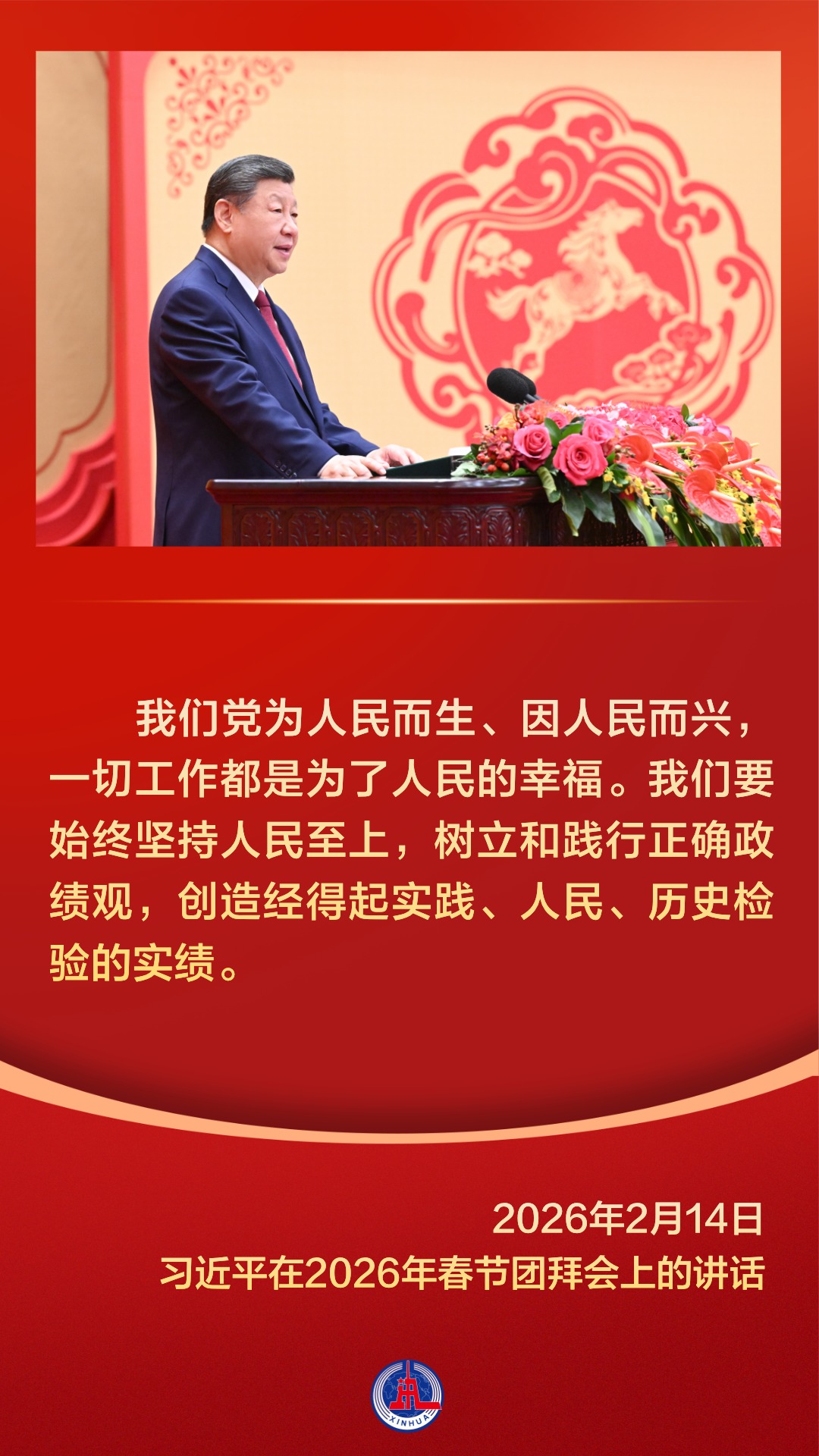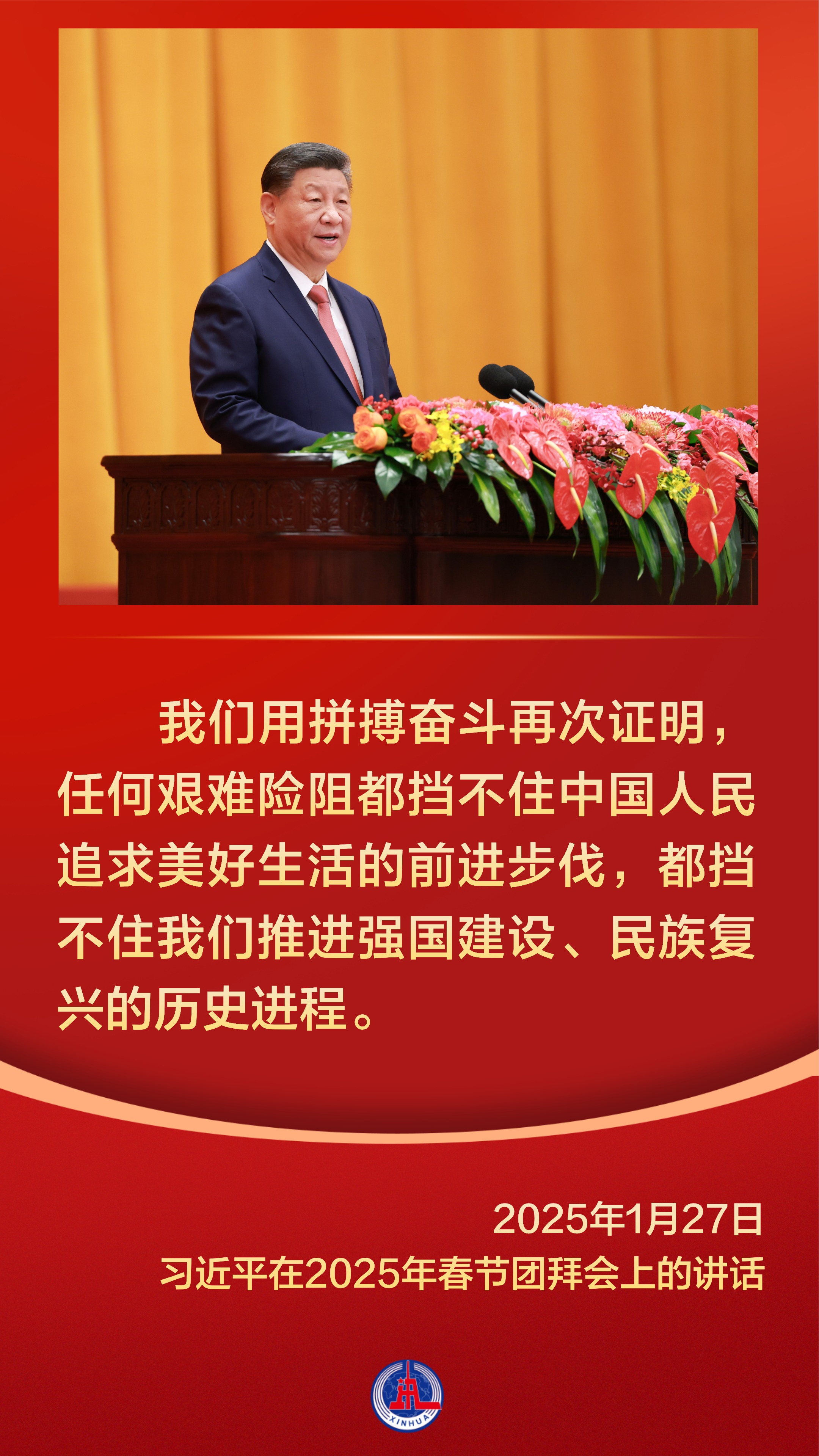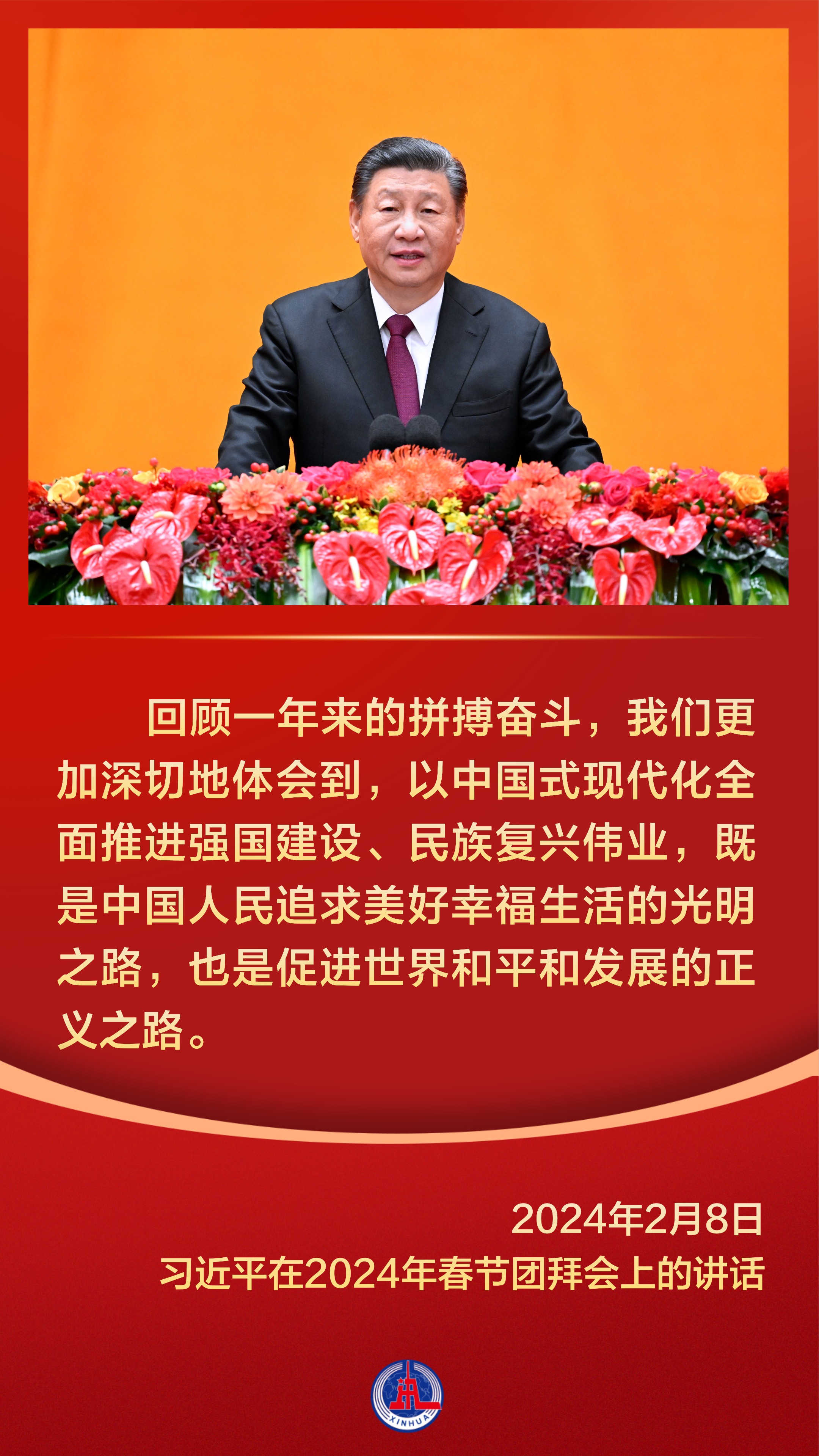 春节,中华民族最重要的传统节日,凝结着亿万中国人的乡愁,承载着无数人最温暖的情感记忆。 党的十八大以来,习近平总书记多次在春节团拜会上发表重要讲话,代表党中央、国务院向全国各族人民、向港澳台同胞和海外侨胞拜年,与大家欢聚一堂,叙友情、话国事,辞旧岁、迎新春。  【人民】 家事国事天下事,让人民过上幸福生活是头等大事。总书记的每一次讲话,始终饱含深厚的人民情怀,彰显新时代中国共产党人的初心使命。     【奋斗】 惟奋斗者进,惟奋斗者强,惟奋斗者胜。纵观习近平总书记在春节团拜会上的讲话,“奋斗”一直是频频出现的主题词。     【家国情怀】 家是最小国,国是千万家。中华民族历来重真情、尚大义,在春节这样一个万家团圆的美好时刻,习近平总书记以家国之情凝聚起亿万人民家国一心的奋进力量。     春节团拜会上,习近平总书记每一次讲话都满怀深情,洋溢着浓浓的年味,温暖而催人奋进。 统筹:杨咏、杨云燕 编导:王洪流 新华社音视频部制作 新华社第一工作室出品