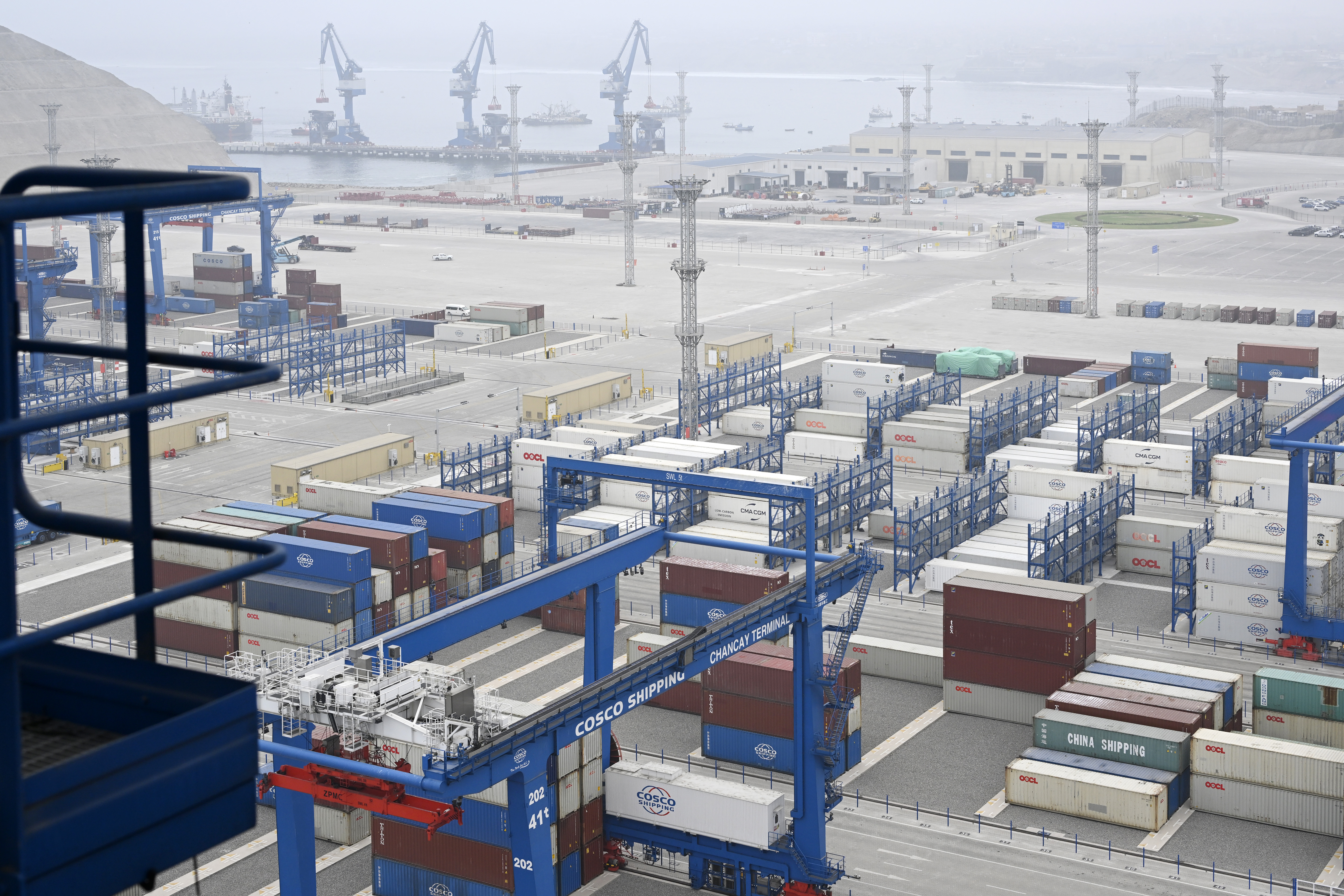 这是2025年5月16日拍摄的秘鲁钱凯港码头摆放的集装箱。新华社记者 李木子 摄