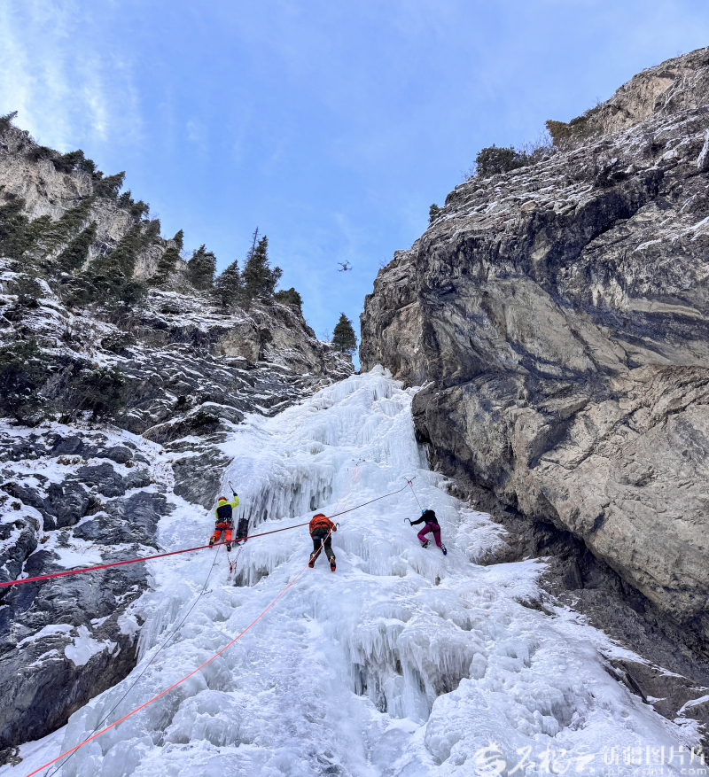 2月22日,来自乌鲁木齐的攀冰爱好者在玛纳斯县一处天然冰瀑上攀冰。