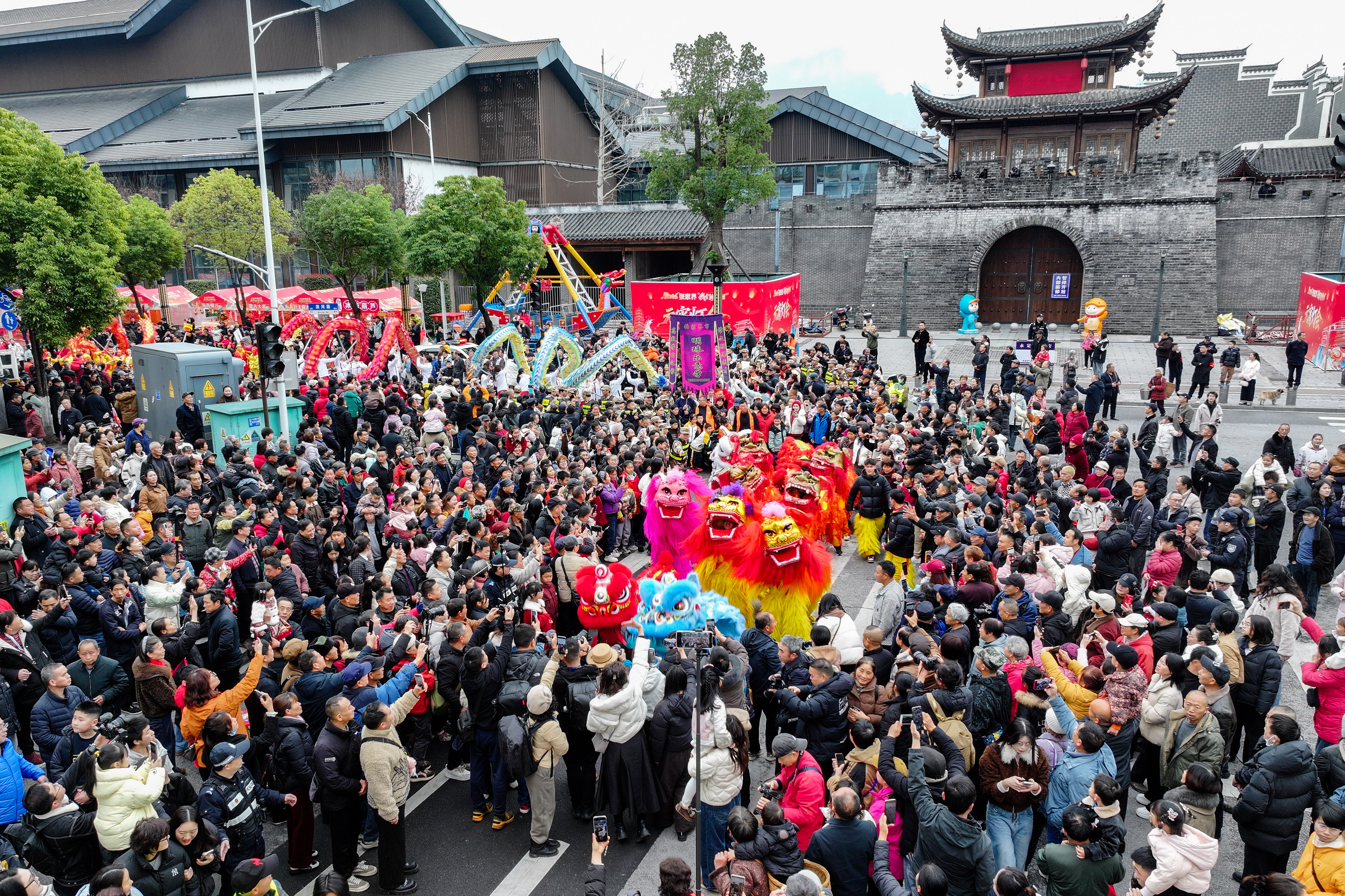 在湖南省张家界市奇幻大庸城,民俗巡游队伍载歌载舞。龙狮方阵气势磅礴,土家花灯方阵温婉灵动,傩舞方阵穿梭于人潮中,祈愿五谷丰登、平安喜乐。