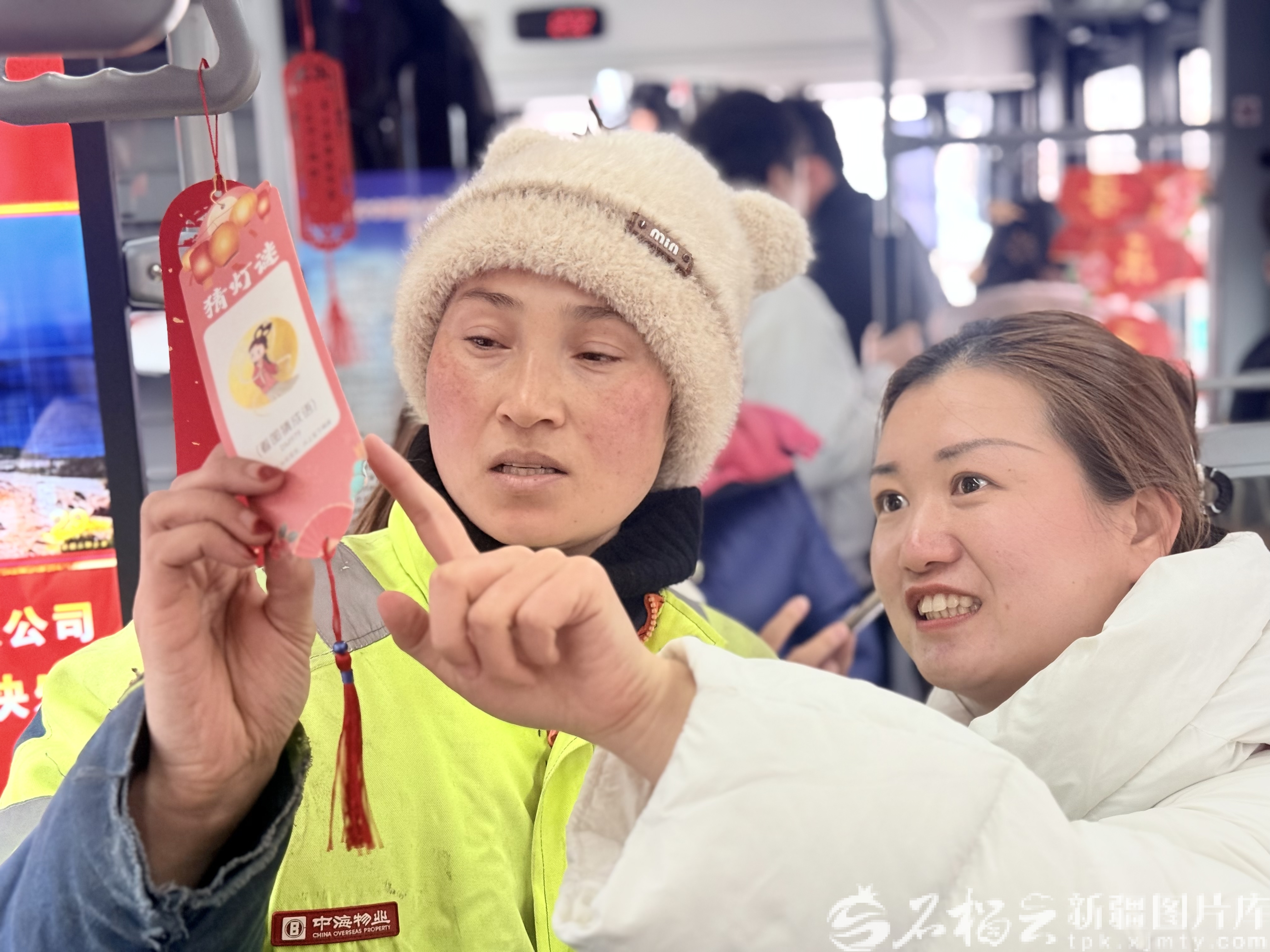 车厢里,环卫工人阿依西古丽·阿卜杜热合曼被邀请上车猜灯谜。她看谜条上画着一轮圆月和仙气飘飘的女孩,迟疑着说:“嫦娥奔月?”一旁的工作人员递上小礼品说:“答对了!”围观人员也跟着欢呼鼓掌。