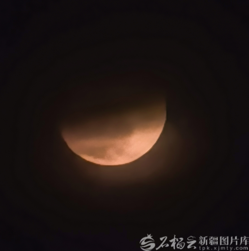 3月3日20时48分,月食进入复圆阶段,月亮呈现暗红色。石榴云/新疆日报记者 邹懿 摄