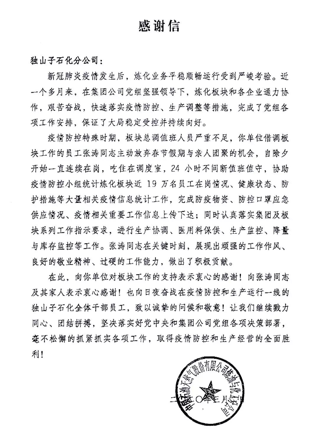 感谢信中对独山子石化借调在炼化板块工作的员工张涛提出特别表扬。表扬他在疫情期间主动放弃与家人团聚的机会,自除夕以来,在板块总调度室岗位24小时值守,顽强敬业、能力过硬,完成了集团公司各项工作安排。