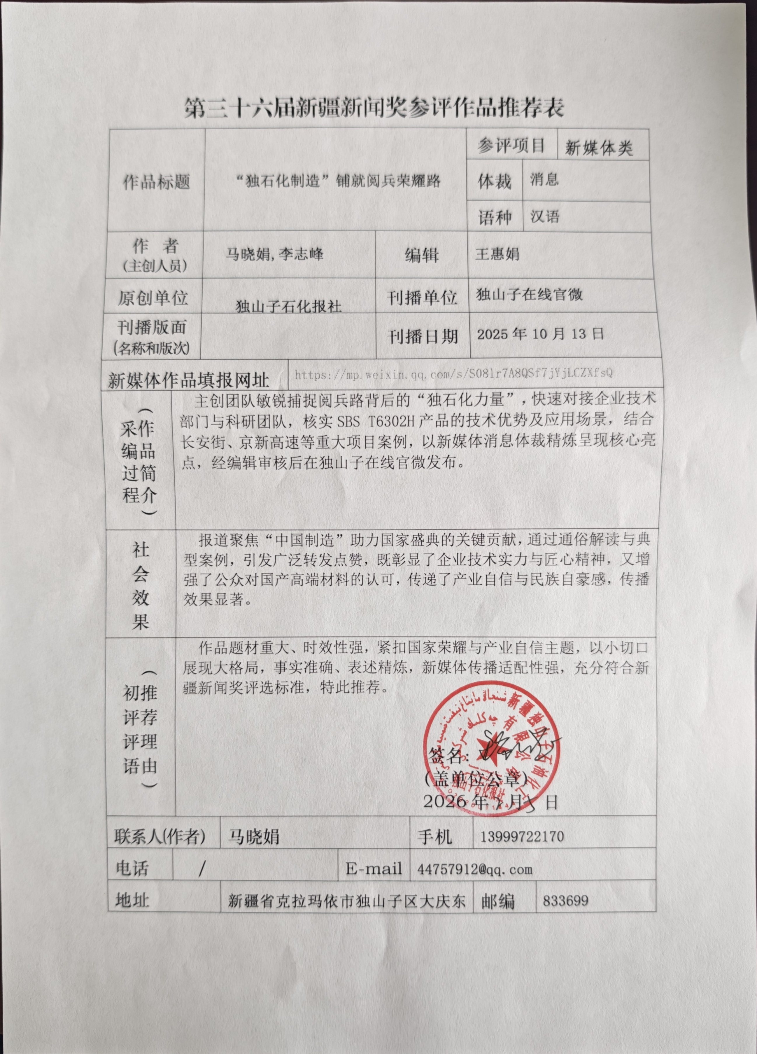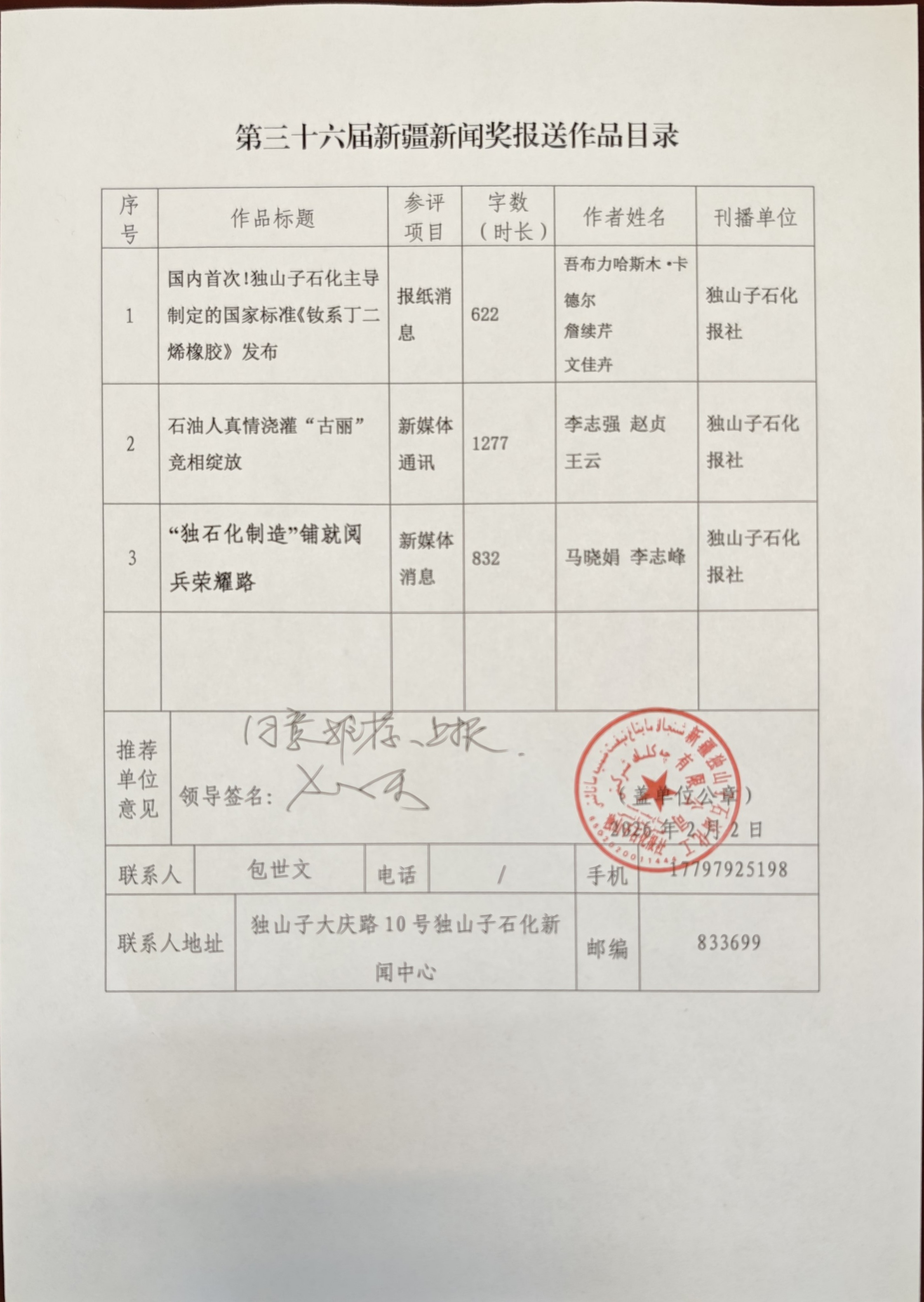 联系地址:新疆克拉玛依市独山子区大庆东路10号独山子石化公司独山子石化报