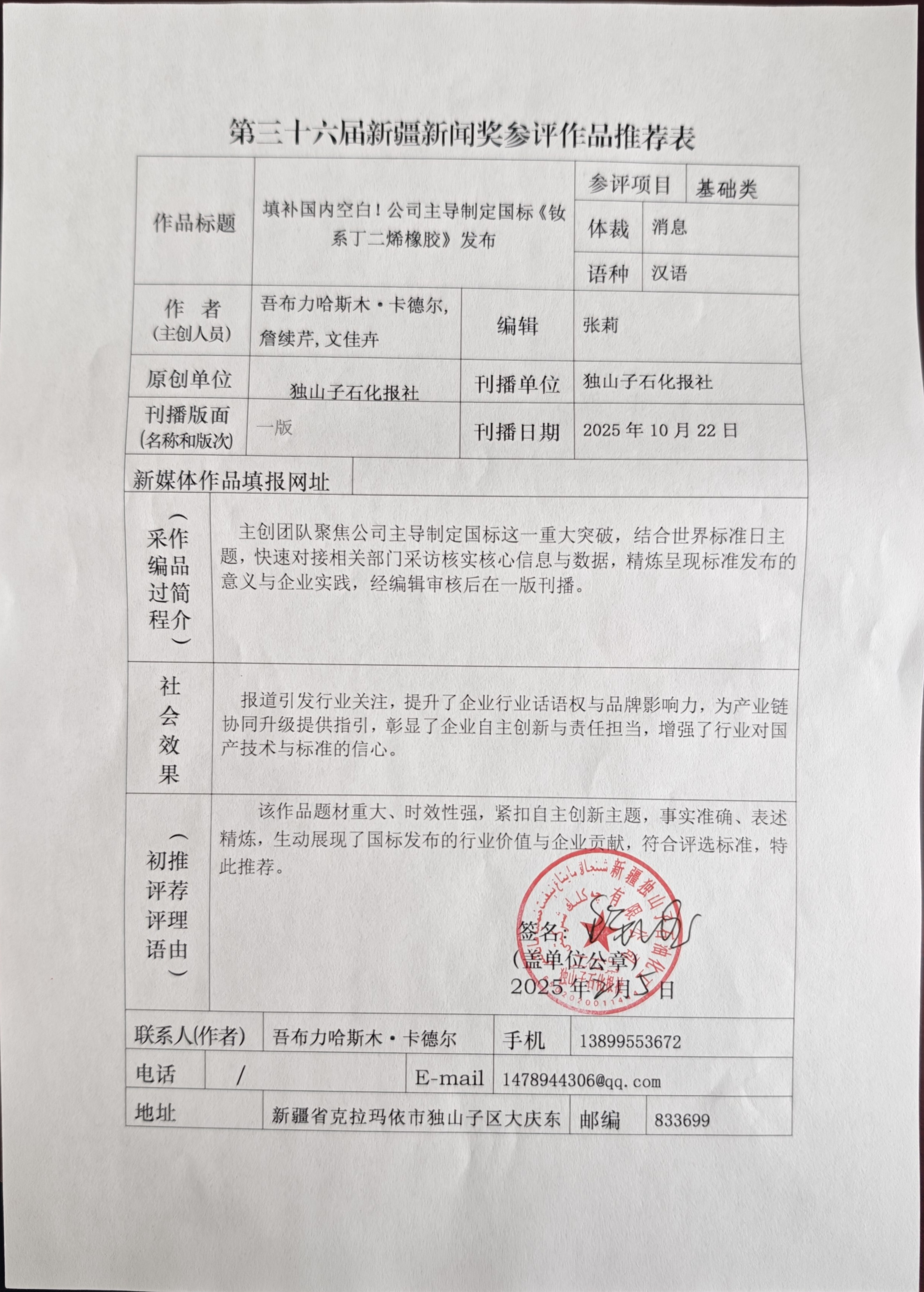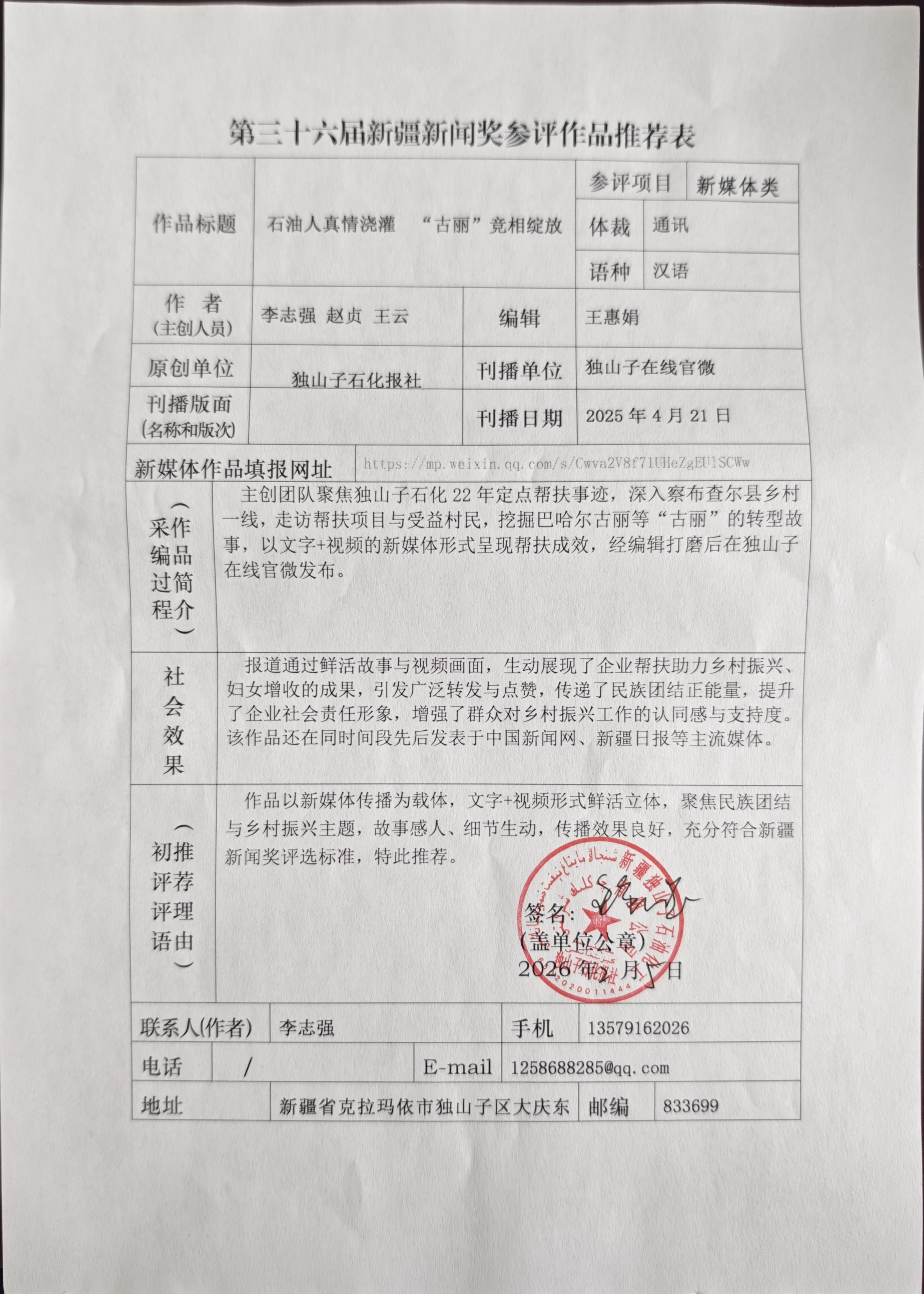 独山子石化报第三十六届新疆新闻奖参评作品公示