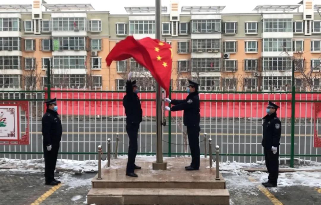 9:30,“请全体肃立,第一项,出旗……”仪式虽然简单,各项程序一丝不苟,广场虽然空旷,神圣氛围庄重如常。警务室的民警护卫着五星红旗,迈着有力的步伐来到旗杆前。嘹亮的国歌声划破了清晨的宁静,升旗手有节奏地拉动升旗绳,鲜艳的五星红旗伴随着雄壮的国歌声,和初升的朝阳冉冉升起,迎风飘扬。