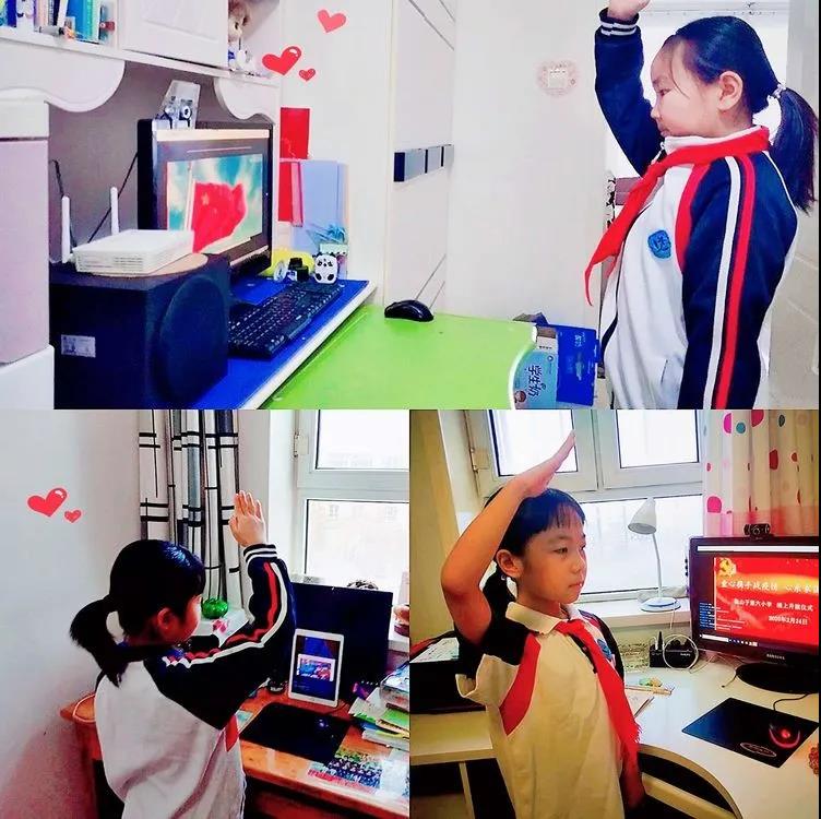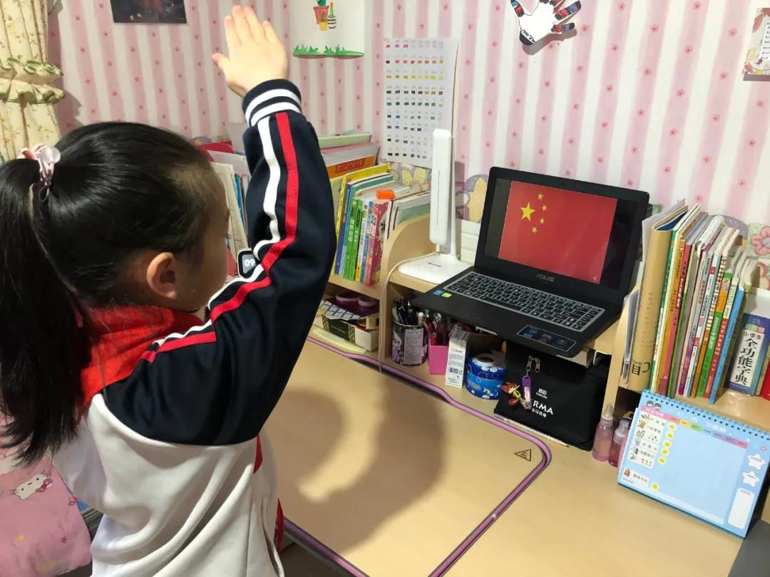 在同一时间,在各学校的号召下,我区中小学生也在家里进行了网络升旗仪式。早晨不到9点,第七小学的学生吴承婉就起床洗漱完毕,穿上了干净的校服,佩戴好十分珍惜的红领巾,等待升旗。当国歌响起,她庄严地敬队礼、唱国歌。她说:“每个周一的早晨学校都要升旗,每当国歌响起我都会自觉地跟唱,这已经是一种习惯了。我热爱我的祖国,我希望能早点开学和同学老师们一起参加升旗仪式。”