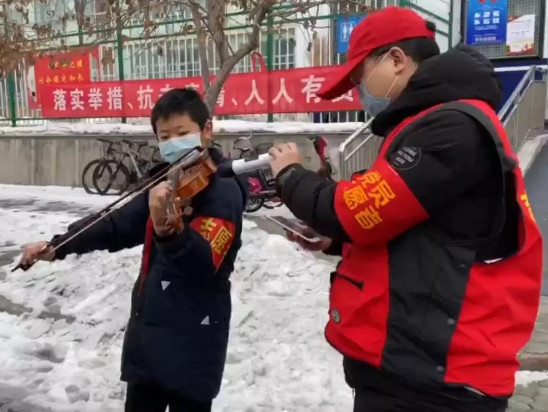 13岁的小志愿者赵子杰,用小提琴演奏了熟悉的旋律《我和我的祖国》。在社区志愿者的领唱下,居民挥舞着小红旗高声歌唱,表达热爱祖国、共抗疫情、共克时艰的坚定信念,传递着打赢疫情防控人民战争的信心与决心。
