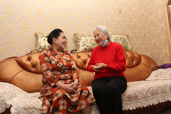 11月16日,82岁的李玉珍从昆园小区8栋来到住在5栋的比力克孜·司马义家中,两人热情地拥抱在了一起,彼此亲切地问候着。