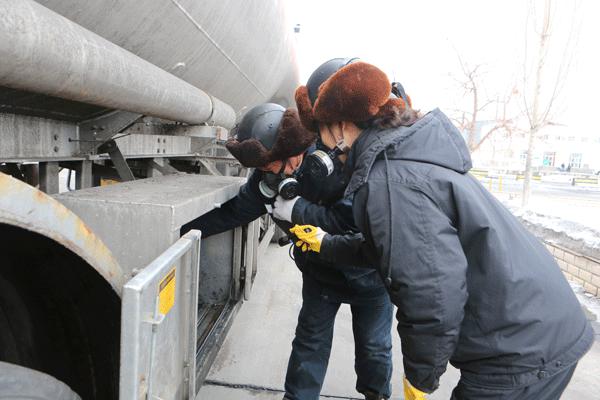 记者跟随两位佩戴防毒面具的女员工来到待检车辆区。两名女员工对油罐车进行安全隐患排查,排查合格的车辆方可入鹤位装车。