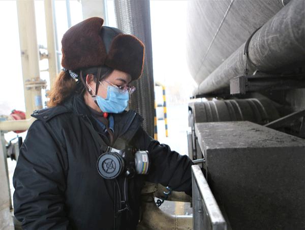 乙烯厂储运联合车间库管一班有32人,均为女职工。冬季极寒天气下,库管一班的女工穿着厚厚的棉衣在现场监护装车,一站就是几个小时。