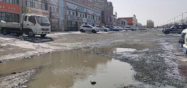 记者在福景佳苑商铺看到,随着气温回升冰雪融化,商铺门口的沙土地完全裸露出来,很多地方还有积水变成了小水坑、泥坑。