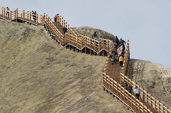 天气晴和,前往泥火山踏青的人很多。不少老人、孩子拿着风筝,或者沿着木栈道,或者走东面山脊小路向上攀爬,风筝飘飞在天空,笑声回荡在山野。在游客中心、市民广场放风筝的人也不少。通往卡子的道路尚未开放,不少人就地在停车场停车,爬上周边的山上,呼吸新鲜空气,观赏自然景致。