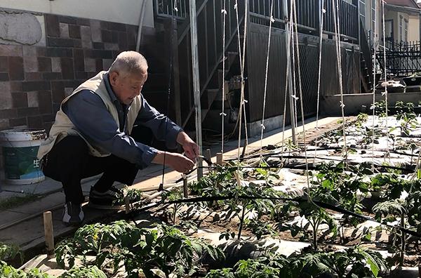 陈师傅家住天馨美墅小区,他在自家小院里开垦了一片十几平方米的菜地,种的有小白菜、菠菜、茄子、辣子、西红柿等,蔬菜在他的精心培育下长势良好。陈师傅说,每天侍弄这片小菜地让他的退休生活充满了乐趣,还锻炼了身体。
