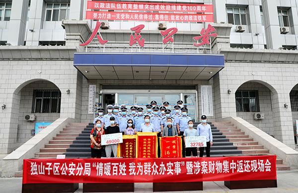 为充分展示公安机关严厉打击违法犯罪的成果,强力震慑犯罪,提升独山子群众安全感和满意度,6月18日,区公安分局召开“情暖百姓,我为群众办实事”涉案财物集中返还现场会,将在打击侵财犯罪中追缴的被盗财物返还给受害群众。