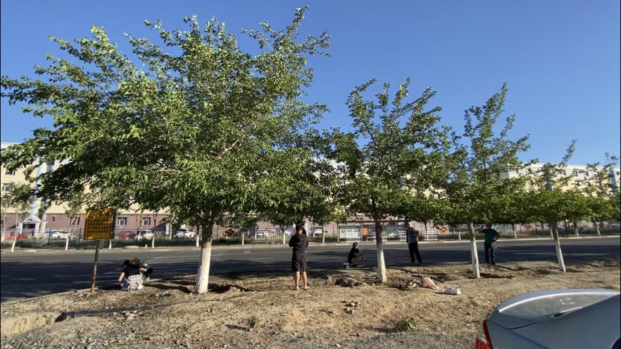 韶山路两旁的桑树上,白的、紫的桑葚缀满枝头,不少市民去采摘,有的拿着长棍打,有的爬上树摇晃树枝,其他人用床单在下面接。