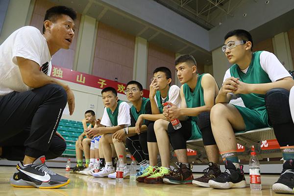 18日晚,新疆广汇青年队在独山子体育中心指导独山子中学生进行训练。