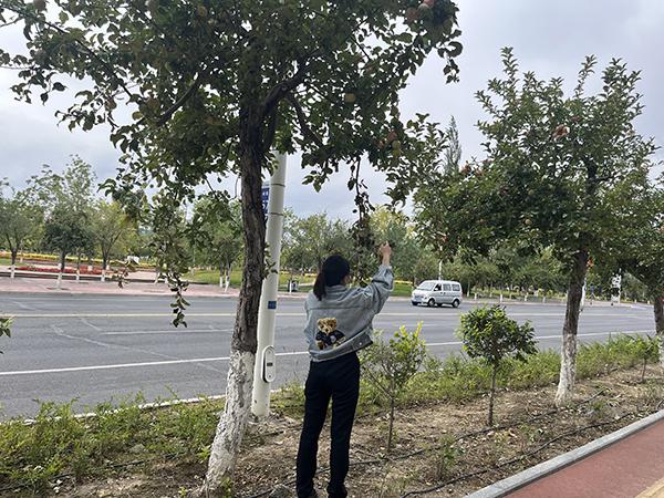 市民张先生说:“这些果子挂在树上多好看,有人非要摘下来尝一口,不好吃又扔得满地都是,太不文明了。” 市民康女士说:“有一次我开车经过长岭路,突然有个东西砸到了车挡风玻璃上,吓我一跳,我赶紧把车停在路边查看,居然是有人拿着棍子在路边打树上的苹果,打飞的苹果砸在我车上了,真是太危险了。” 区城市管理局的工作人员付苗苗说:“绿化果树上的苹果虽然好看,但不建议食用,因为果树上病虫害较多,园林绿化部门会定期喷洒农药进行防治,果子上会有农药及重金属残留,过多食用不利于身体健康。” 城市绿化工作是一个漫长的过程,种植在道路两侧的绿化果树具有净化空气、美化环境的作用,请大家在享受绿意盎然的舒适环境时,也要承担起维护绿化环境的义务。