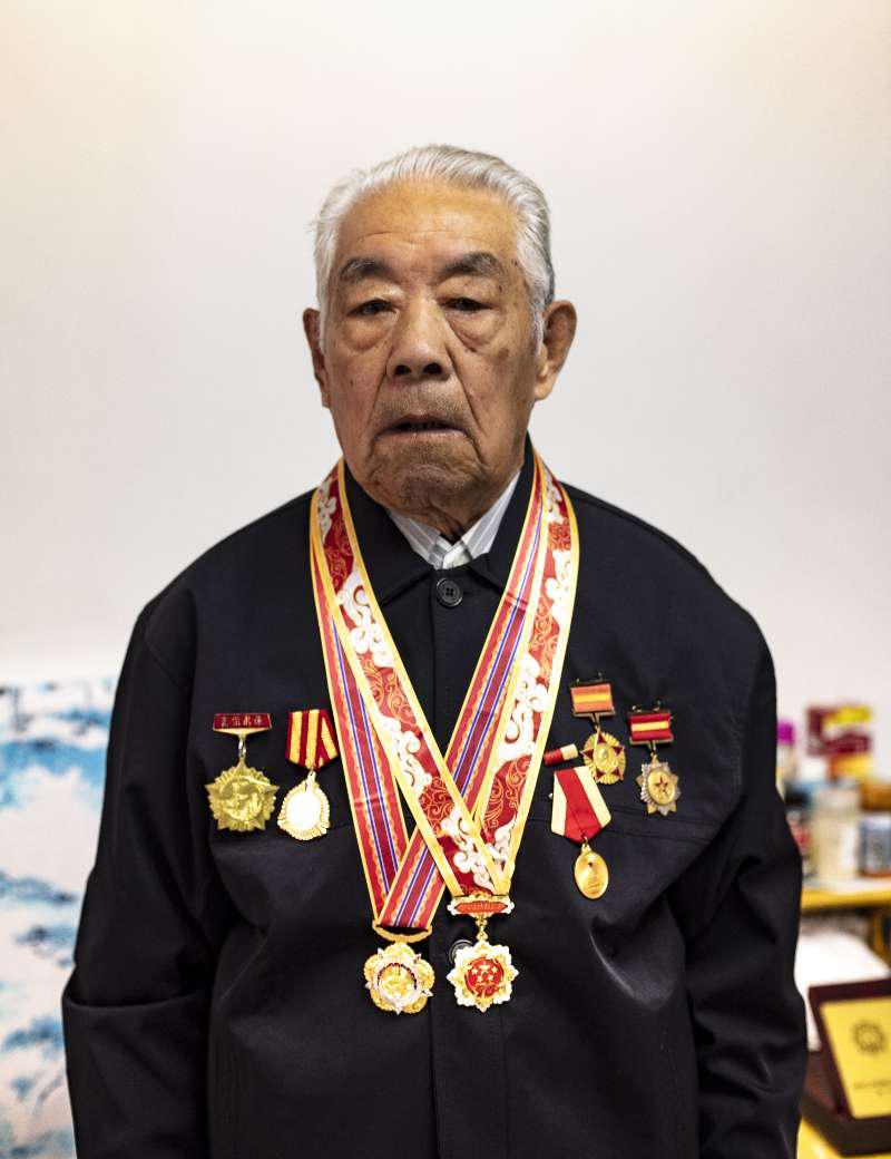 毛元良爷爷的女儿给我们展示了老人身穿军装、身上戴满荣誉勋章的一张照片。照片中的他虽已年迈但神采奕奕。