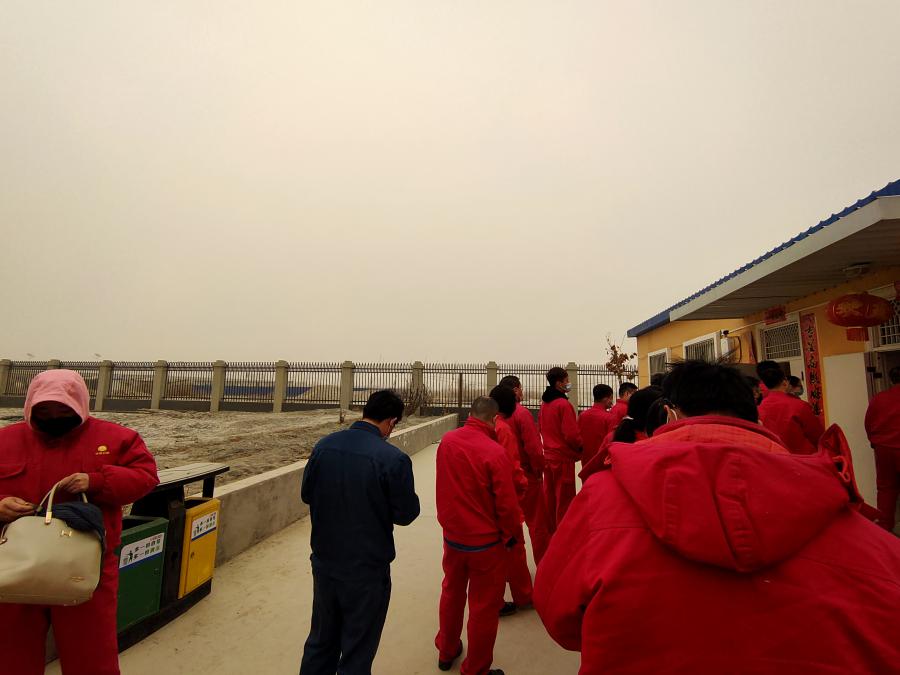 在他们中间,有身着蓝色牛仔工装从独山子石化公司赶来的员工,也有身着大红色工服的当地员工,而他们胸前的宝石花标识却是一样的,即使是在这样的黄沙天气里,依旧看得分明!虽来自不同的地方,但在这里,他们早已结成战友兄弟,为实现项目按期开工这个目标,共同奋斗!