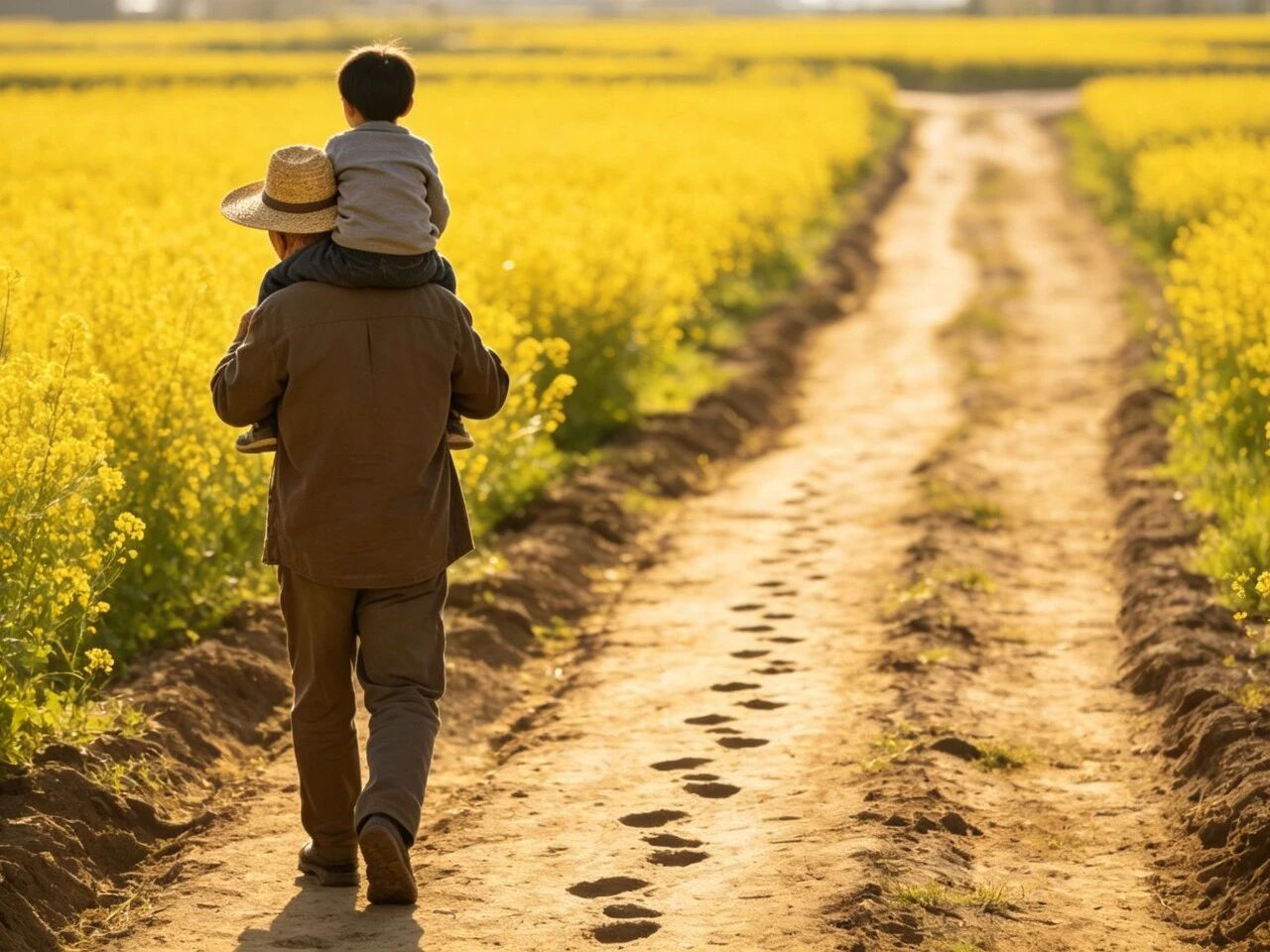 夕阳西下,爷爷再一次将我扛在肩头,时不时回头望向祖坟的方向。他说:“我在一年,孙儿便跟我上一次坟,等爷爷不在了,孙儿也长大了。” 2015年的那一天,接到父亲的电话,我一路狂奔。出租车上,我不停地催促司机:“叔叔,能不能再快一些?”遇上高峰期路段拥堵,我直接打开车门,沿着停滞的车流跑了近两公里,赶上了回家的最后一班车。 在您的床前,我拼命攥紧您的手,您用尽全身力气,为我擦掉眼泪,一字一句地说:“乖乖别怕,爷爷只是要去找自己的爷爷奶奶和爸爸妈妈了。” 世间终究没有奇迹,那一天,您永远地离开了我。可是爷爷,你知道吗?那是我第一次觉得,自己失去了生命中最重要的人。 曾在网络上看到过这样一段话——“小时候,害怕高高的树林里有坟,害怕世上有鬼,直到后来,最爱我的人也躺在了里面,我便再也不害怕了。因为那座别人畏惧的孤山、那座坟茔,住着我想见却再也见不到的人。”如今,我深以为然。 去年清明,在您的坟前,父亲、母亲,几位叔叔和婶娘,还有哥哥弟弟们,一大家子聚在一起,热热闹闹,满是烟火气。我向父亲借来他的旱烟斗,把烟叶裹好放进烟斗点燃,然后对父亲说:“爸,等爷爷抽完您再抽哈。” 随后,我拿着镰刀走到您的坟前,跟家人们说道:“今年爷爷的坟头草,我来割,你们谁都不要插手。”三叔在一旁笑着打趣:“你爷爷生前最疼你,你不割谁割?!”其他兄弟姐妹纷纷附和:“就是!就是!” 等把您坟冢周围的杂草全部清理干净,我坐在坟前,望着暖阳,思绪仿佛又回到了儿时那些年,耳畔也一遍遍响起您对我说过的话。原来,“我懂您时,我已长大;再想您时,您已远去。日子好短,短到来不及好好告别;日子又好长,长到需要用一辈子的时间,去怀念,去牵挂。” “三叔!三叔!这是谁呀……”小侄女拽着我的衣角,把我从回忆里拉了出来。我轻轻抱起她,柔声说:“这是三叔和你爸爸的爷爷,是你的曾祖父。” “噢噢!那我要给曾祖父磕头。” “爷爷,您看,这是您的曾孙女。您要像保佑我一样,保佑她快快乐乐地长大呀!” “爷爷!爷爷!快来呀……”听着小侄女一声声稚嫩的呼喊,父亲从油菜花林里回过头,应道:“乖乖,爷爷在这儿呢!” 恍惚间,我也想起从前,不见您身影时,我也曾这样声声呼唤,而您总会从那片最美的油菜花丛中走过来,戴着那顶熟悉的草帽,回过头笑着回应我:“爷爷在这儿呢。” 夕阳西下,又到了离别的时刻。父亲将小侄女扛在肩头,一如当年您扛起我,在夕阳的余晖里,朝着家的方向,一步一步,慢慢走着……(本文部分配图由AI生成)