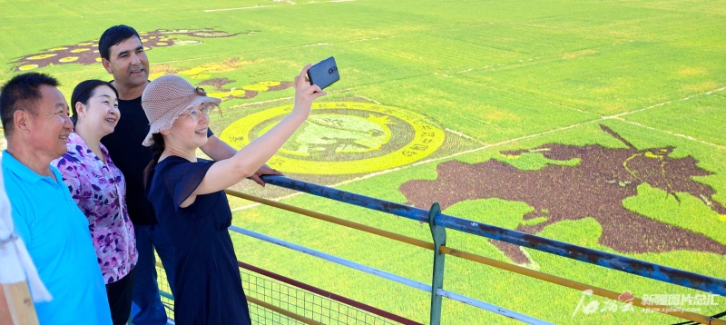 7月16日,在伊犁哈萨克自治州察布查尔锡伯自治县纳达齐牛录乡“如意·稻田画”基地,游客在玻璃栈道上自拍。华岩明摄 7月16日,在伊犁哈萨克自治州察布查尔锡伯自治县纳达齐牛录乡“如意·稻田画”基地,一批游客被美景吸引,纷纷在玻璃栈道上自拍留影。该基地稻田画由“中华民族一家亲·同心共筑中国梦”“ 桃园三结义”“ 孔雀开屏”等6幅图案组成,目前,稻田画已进入最佳观赏期。