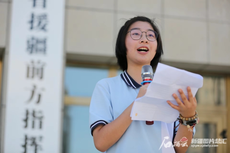 7月18日,闽疆师生民族团结联谊家访活动启动仪式上,福建省长乐华侨中学学生代表陈诗怡发言。
