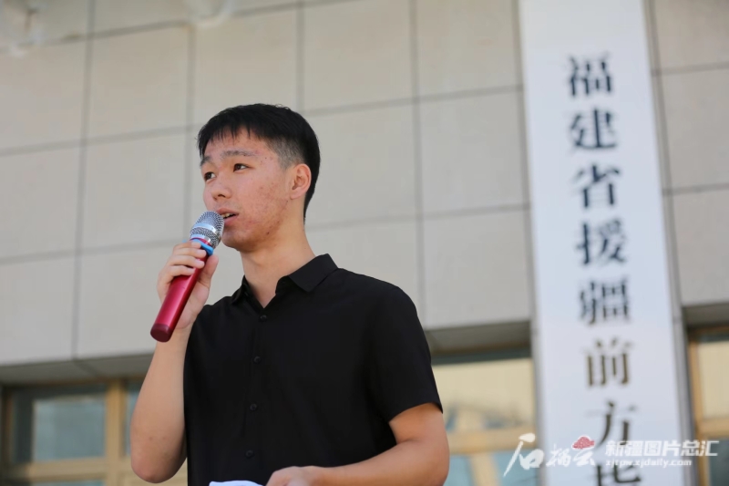 7月18日,闽疆师生民族团结联谊家访活动启动仪式上,毕业于福建省长乐华侨中学的新疆学生代表叶力仔·哈帕斯发言。