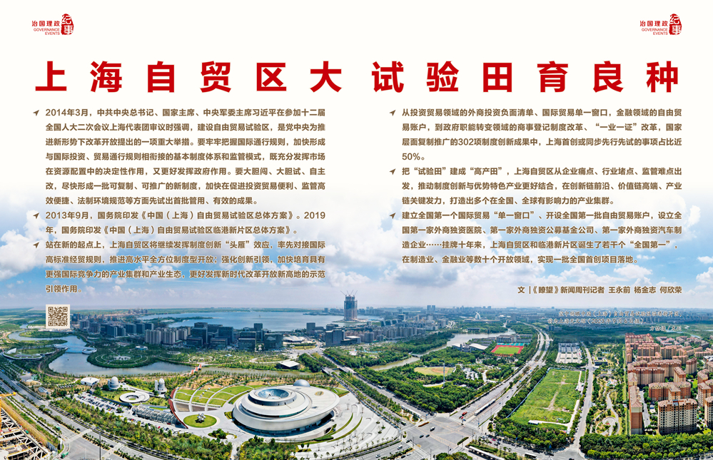 ◇2014年3月,中共中央总书记、国家主席、中央军委主席习近平在参加十二届全国人大二次会议上海代表团审议时强调,建设自由贸易试验区,是党中央为推进新形势下改革开放提出的一项重大举措。要牢牢把握国际通行规则,加快形成与国际投资、贸易通行规则相衔接的基本制度体系和监管模式,既充分发挥市场在资源配置中的决定性作用,又更好发挥政府作用。要大胆闯、大胆试、自主改,尽快形成一批可复制、可推广的新制度,加快在促进投资贸易便利、监管高效便捷、法制环境规范等方面先试出首批管用、有效的成果。 ◇2013年9月,国务院印发《中国(上海)自由贸易试验区总体方案》。2019年,国务院印发《中国(上海)自由贸易试验区临港新片区总体方案》。 ◇站在新的起点上,上海自贸区将继续发挥制度创新“头雁”效应,率先对接国际高标准经贸规则,推进高水平全方位制度型开放;强化创新引领,加快培育具有更强国际竞争力的产业集群和产业生态,更好发挥新时代改革开放新高地的示范引领作用。 ◇从投资贸易领域的外商投资负面清单、国际贸易单一窗口,金融领域的自由贸易账户,到政府职能转变领域的商事登记制度改革、“一业一证”改革,国家层面复制推广的302项制度创新成果中,上海首创或同步先行先试的事项占比近50%。 ◇把“试验田”建成“高产田”,上海自贸区从企业痛点、行业堵点、监管难点出发,推动制度创新与优势特色产业更好结合,在创新链前沿、价值链高端、产业链关键发力,打造出多个在全国、全球有影响力的产业集群。 ◇建立全国第一个国际贸易“单一窗口”、开设全国第一批自由贸易账户,设立全国第一家外商独资医院、第一家外商独资公募基金公司、第一家外商独资汽车制造企业……挂牌十年来,上海自贸区和临港新片区诞生了若干个“全国第一”,在制造业、金融业等数十个开放领域,实现一批全国首创项目落地。 文 |《瞭望》新闻周刊记者 王永前 杨金志 何欣荣 2023年9月,中国首个自由贸易试验区——中国(上海)自由贸易试验区(以下简称上海自贸区)迎来运行十周年。 十年前,上海自贸区在东海之滨初试啼声,引来世界关注。外商投资负面清单管理、国际贸易单一窗口、自由贸易账户、商事登记制度改革……一批批制度创新成果从这里走向全国。 建设自由贸易试验区是党中央在新时代推进改革开放的一项战略举措,在我国改革开放进程中具有里程碑意义。 2014年3月,中共中央总书记、国家主席、中央军委主席习近平在参加十二届全国人大二次会议上海代表团审议时强调,建设自由贸易试验区,是党中央为推进新形势下改革开放提出的一项重大举措。要牢牢把握国际通行规则,加快形成与国际投资、贸易通行规则相衔接的基本制度体系和监管模式,既充分发挥市场在资源配置中的决定性作用,又更好发挥政府作用。要大胆闯、大胆试、自主改,尽快形成一批可复制、可推广的新制度,加快在促进投资贸易便利、监管高效便捷、法制环境规范等方面先试出首批管用、有效的成果。 2013年9月,国务院印发《中国(上海)自由贸易试验区总体方案》。2019年,国务院印发《中国(上海)自由贸易试验区临港新片区总体方案》。2023年7月,国务院印发《关于在有条件的自由贸易试验区和自由贸易港试点对接国际高标准推进制度型开放的若干措施》,提出率先在上海、广东等具备条件的自由贸易试验区和海南自由贸易港,统筹开放和安全,构建与高水平制度型开放相衔接的制度体系和监管模式。 一粒良种,可以播撒希望;一株新苗,可以长成大树。运行十年,上海自贸区枝繁叶茂:至2022年底,累计新设企业8.4万户,是前20年同一区域的2.35倍。累计新设外资项目逾1.4万个,累计实到外资586亿美元,相当于每分钟就有逾一万美元的实到外资“到账”。全国范围内,已设立21个自贸区及海南自由贸易港,覆盖51个城市和海南岛全岛,向全国复制推广302项制度创新成果,形成了覆盖东西南北中,统筹沿海、内陆、沿边的高水平改革开放新格局。 如今,上海自贸区已经成为深化改革的试验田、制度型开放的先行者、深度融入经济全球化的重要载体。 党的二十大报告提出:“实施自由贸易试验区提升战略”。站在新的起点上,上海自贸区将继续发挥制度创新“头雁”效应,率先对接国际高标准经贸规则,推进高水平全方位制度型开放;强化创新引领,加快培育具有更强国际竞争力的产业集群和产业生态,更好发挥新时代改革开放新高地的示范引领作用。 空中远眺中国(上海)自由贸易试验区陆家嘴片区(2023 年 3 月 3 日摄)方喆摄 / 本刊 推动“苗圃变森林”,为国家试制度 自贸区是国家的试验田,不是地方的自留地;是制度创新的高地,不是优惠政策的洼地;是种苗圃,不是栽盆景。在上海自贸区走访,不少基层干部、经营主体表示,自贸区运行十年来,这三句话贯穿始终。 为国家试制度,深深镌刻在自贸区的成长基因里。 ——从投资贸易到政府改革,302项自贸区制度创新成果近半数源自上海或同步先行先试。 外商投资负面清单,是上海自贸区成立后推出的一项重大改革措施。“从正面清单管理模式到负面清单管理模式,这是一个划时代的改革。”在接受《瞭望》新闻周刊记者采访时,一直关注自贸区改革的上海交通大学上海高级金融学院副院长张湧表