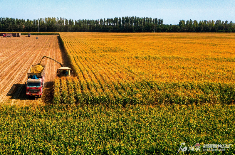 克拉玛依市国家现代农业示范区内,玉米收割机正在一片农田里作业。闵勇摄