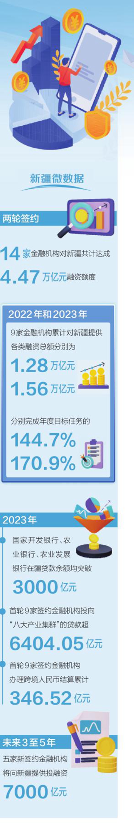 □石榴云/新疆日报记者 王永飞 2023年入冬以来,有5家金融机构与自治区人民政府签署了战略合作协议。这是继2022年初9家金融机构与自治区签署战略合作协议之后,金融机构与自治区人民政府掀起的新一轮合作浪潮。 两轮签约,14家金融机构对新疆共计达成4.47万亿元的融资额度。 丝绸之路经济带核心区建设,赋予新疆在国家向西开放总体战略中重要门户的地位。而中国(新疆)自由贸易试验区的揭牌,则进一步赋予了新疆建设新时代对外开放新高地的历史使命。 金融机构纷纷签约,体现出其敏锐的市场嗅觉,以及对新疆发展前景的强大信心,将给新疆经济社会发展带来巨量资金支持,为新疆实体经济强身健体的同时,必将推动新疆以更加自信的姿态拥抱世界。