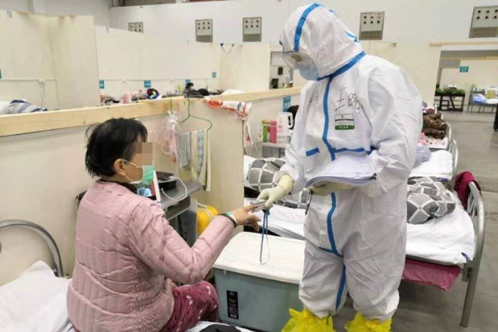 甘肃省第二批援助湖北医疗队队员、河西学院附属张掖人民医院护士魏建芬在武汉协和医院西院区护理患者。(河西学院附属张掖人民医院供图)