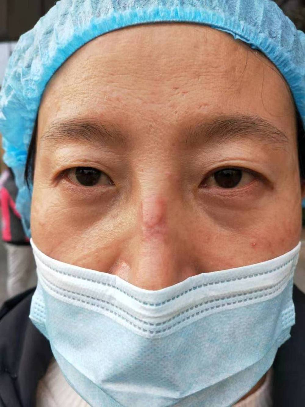 甘肃省第二批援助湖北医疗队队员、甘肃省第二人民医院护士顾小萍在抗疫一线长时间佩戴防护镜脸上出现印痕。(甘肃省第二人民医院供图)