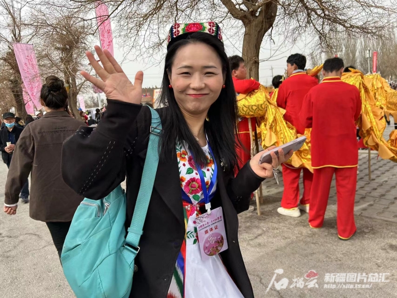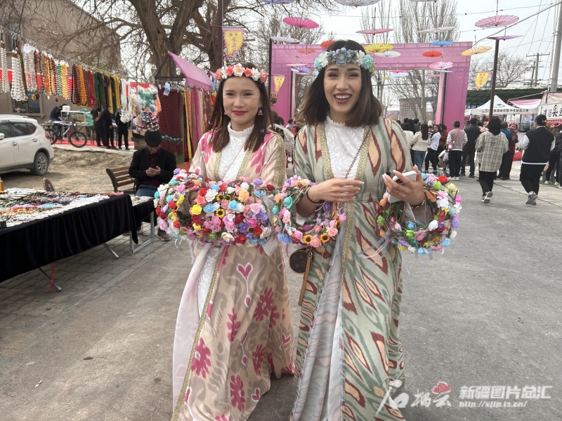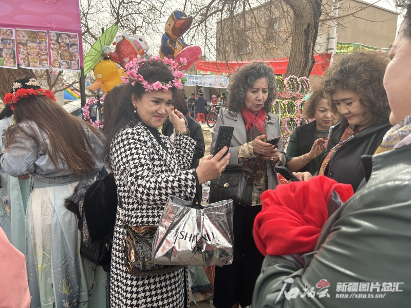 托克逊杏花节上,正在卖花环的姑娘。石榴云/新疆日报记者 阿比拜 摄 杭富荣一行11名游客是来新疆追花的。旅行团还有一个名字叫“追新疆花的广东仔”。春节期间,大家都说好了要去帕米尔高原看杏花。没有想到,昨天抵达就看到了托克逊杏花节的消息,于是在旅行管家的推荐下增加了行程,专程来到托克逊。 虽然花不多,但是现场精彩的节目、热情的当地民众都成了他们眼中最美的景色。大家一致决定,从帕米尔回来,再来一次托克逊。 杏花虽然没有开,但是现场依旧处处是“花”。头上戴着的花环,手里拿着的仿真花枝,花形的扇子等等,就连餐厅的桌子、椅子上都贴满了杏花的图标。