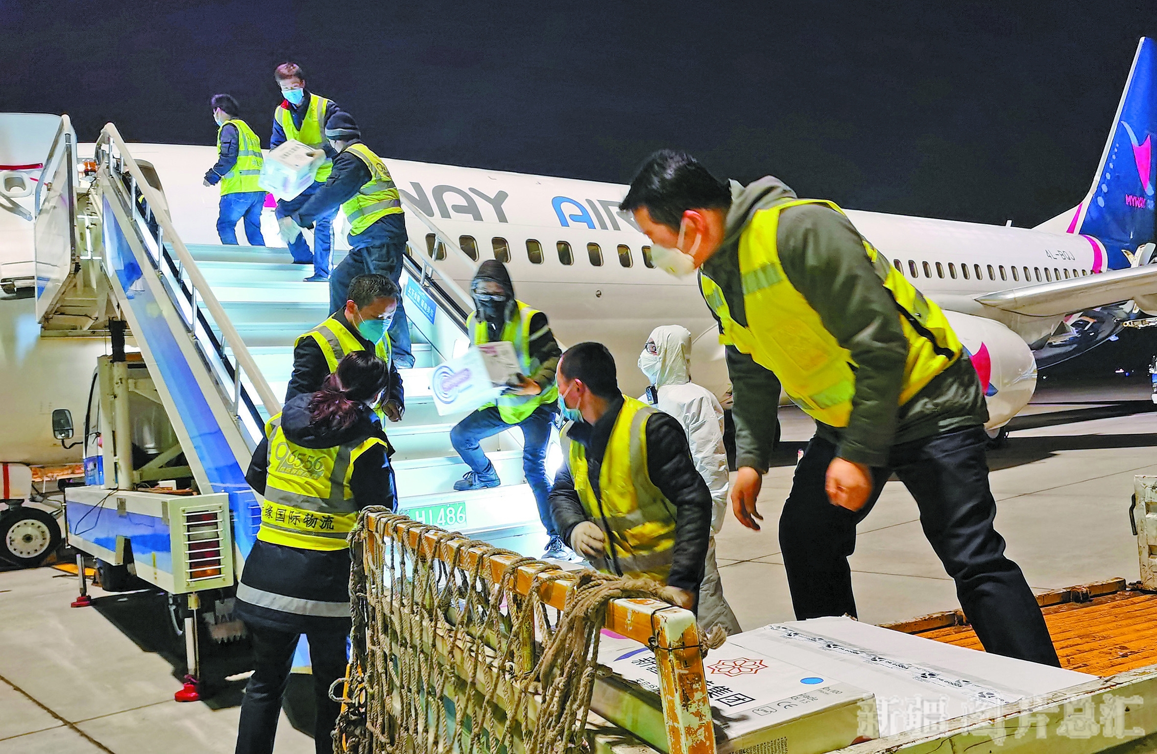 2月21日晚,载有6.5吨近百万件防疫物资的专机抵达乌鲁木齐地窝堡国际机场。这是华凌集团筹集的第二批防疫物资。 □王守林摄