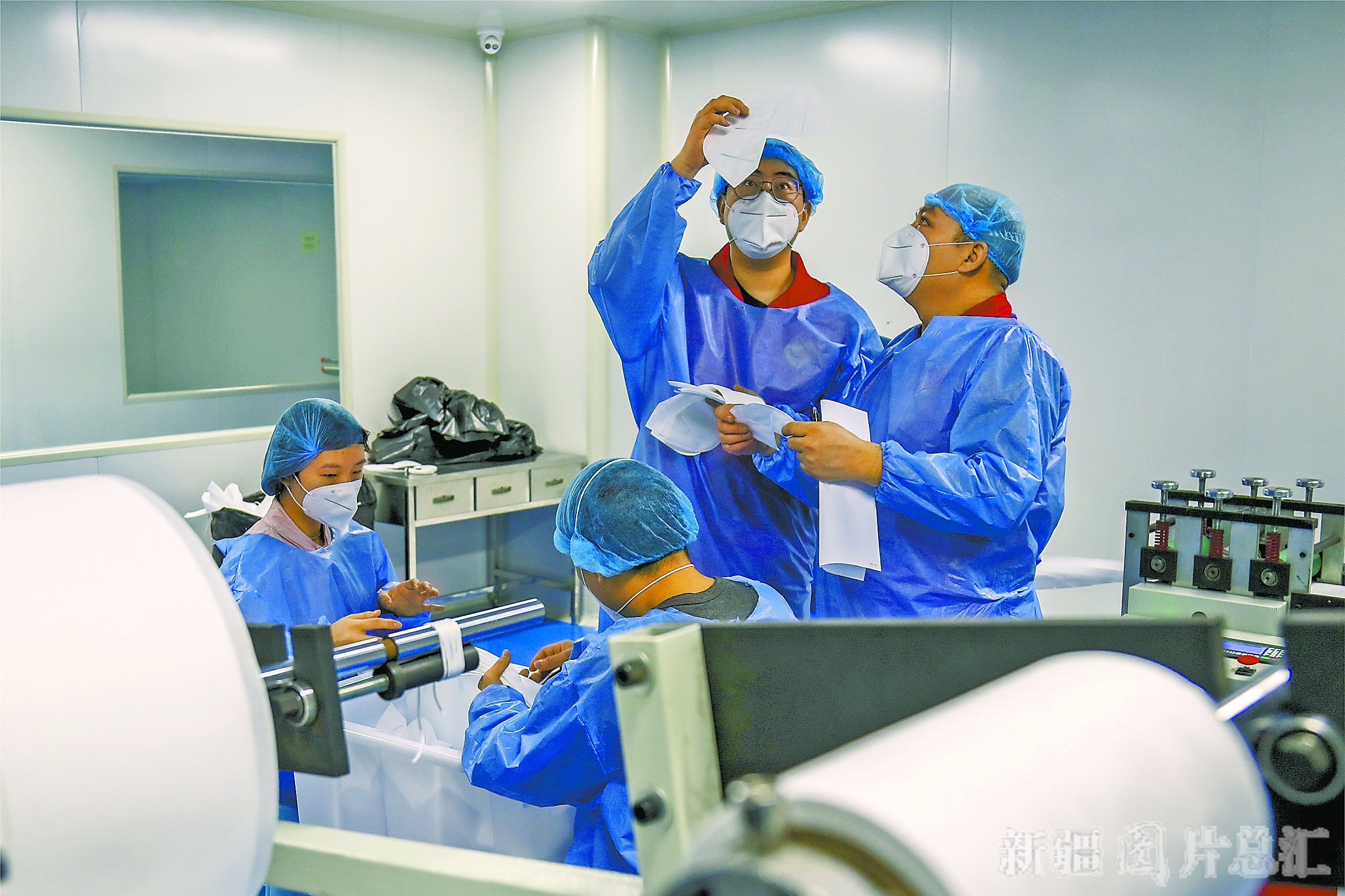 2月25日,在位于乌鲁木齐高新区(新市区)工业园区的众康公司医用防护口罩生产车间,工作人员在巡检。□本报全媒体记者 谢龙摄