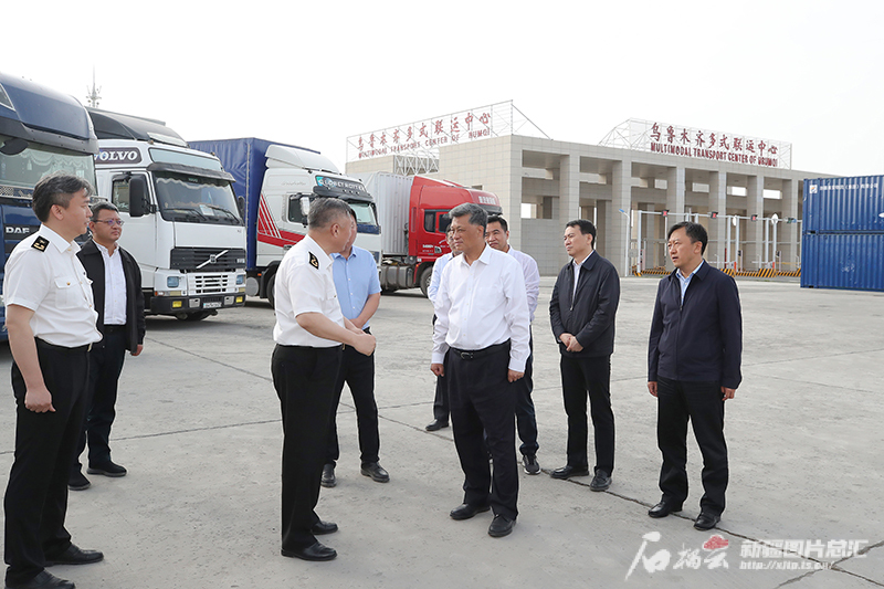 5月17日,自治区党委书记马兴瑞在乌鲁木齐国际陆港区多式联运中心集装箱堆场,同海关、商务部门和新疆商贸物流集团负责同志交流。石榴云/新疆日报记者 崔志坚摄