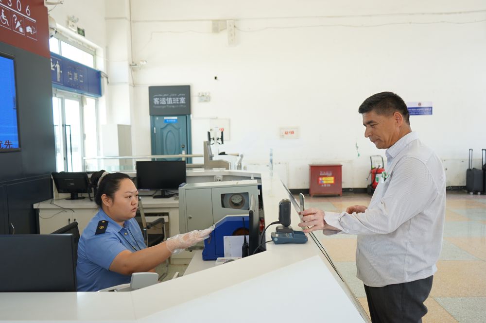 8月1日,依马买买提·赛帕尔在阿图什车站购买前往和田站的车票。新华社记者靳博文 摄 列车缓缓驶入阿图什站。今年54岁、卖无花果的果农依马买买提·赛帕尔早已在11号车厢处等候。车门打开,他在列车员帮助下,拉着小推车,提溜打包好的鲜果,在靠近车门处落座。