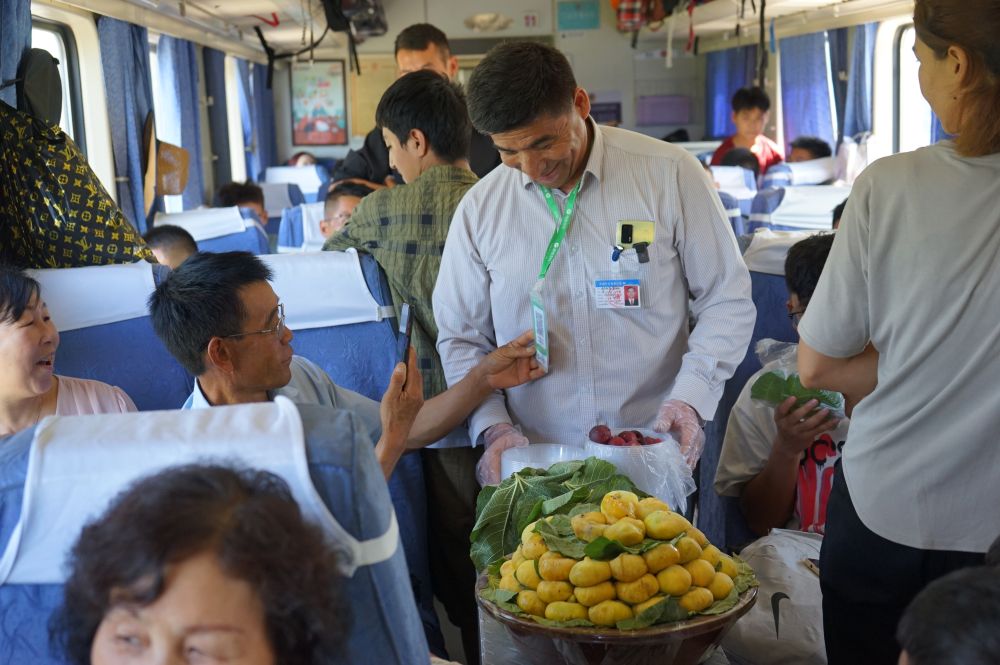 8月1日,依马买买提·赛帕尔在7557次列车上向旅客售卖无花果。新华社记者靳博文 摄 担任列车长7年的坡拉提汗记住了许多熟面孔,包括两年前开始登车的依马买买提。到了巴扎日,他就惦念着谁来谁没来,“听说有好的特色农产品,我们会亲自到老乡家看一看,合适的就请到‘流动巴扎’上来”。