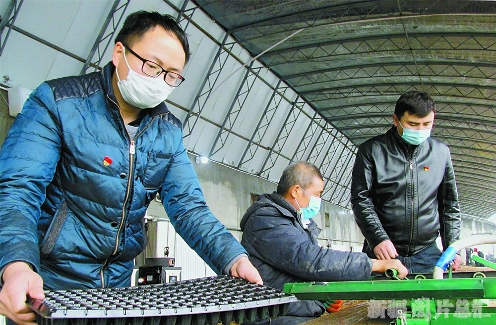 3月23日,驻村工作队队员和社员一起培育番茄苗。塔城地委组织部驻裕民县吉也克镇库萨克北村“访惠聚”工作队指导合作社利用温室大棚自主育苗备春种,带领社员脱贫致富。 杨化光摄