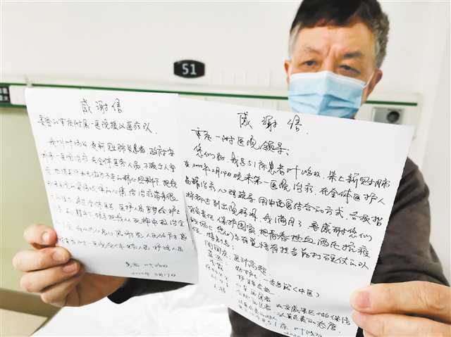 3月17日,武汉市第一医院,一名即将出院的患者展示他写给重庆医疗队的感谢信。 |